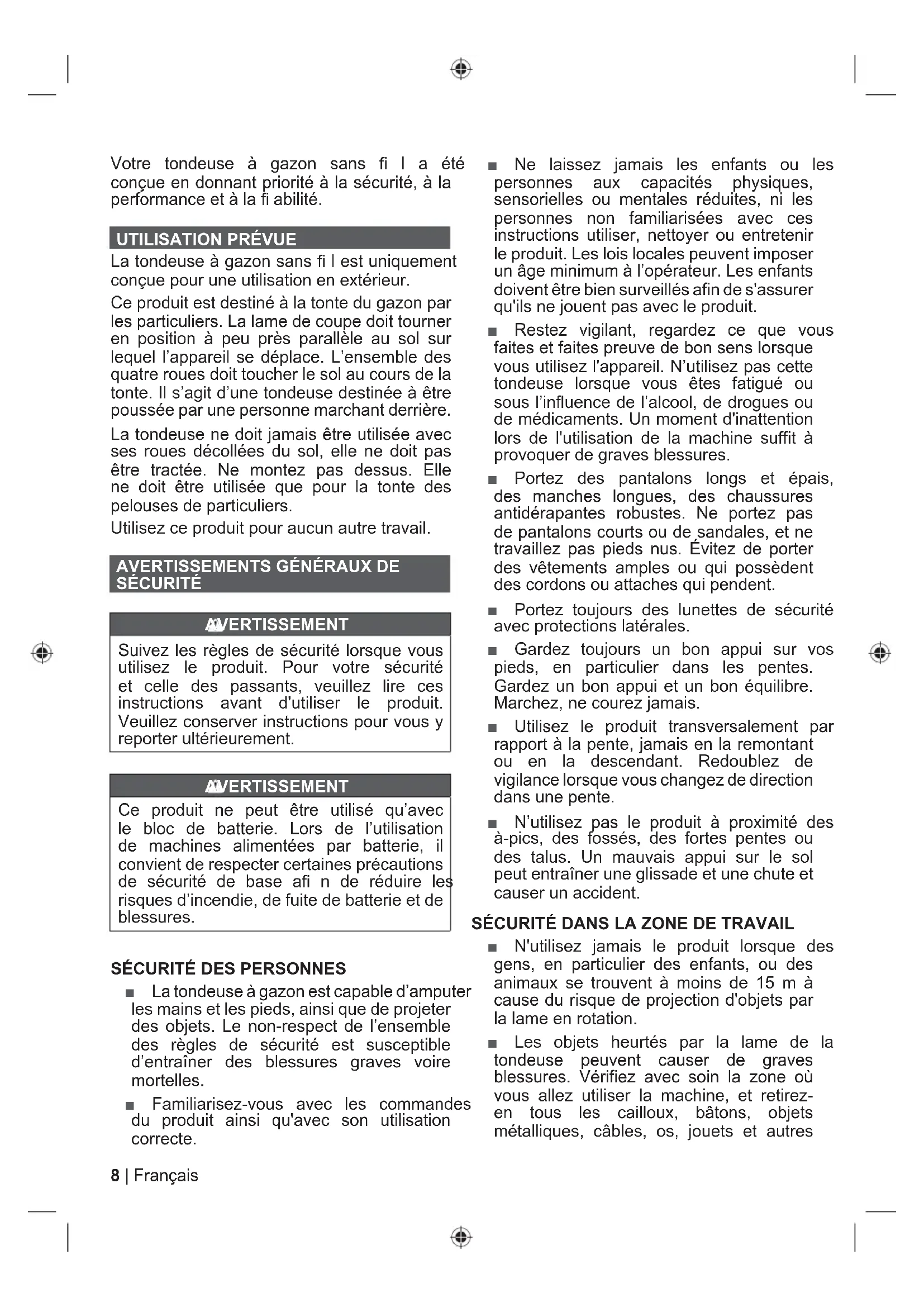 TRVotre tondeuse à gazon sans ¿ l a été conçue en donnant priorité à la sécurité, à la performance et à la ¿ abilité.