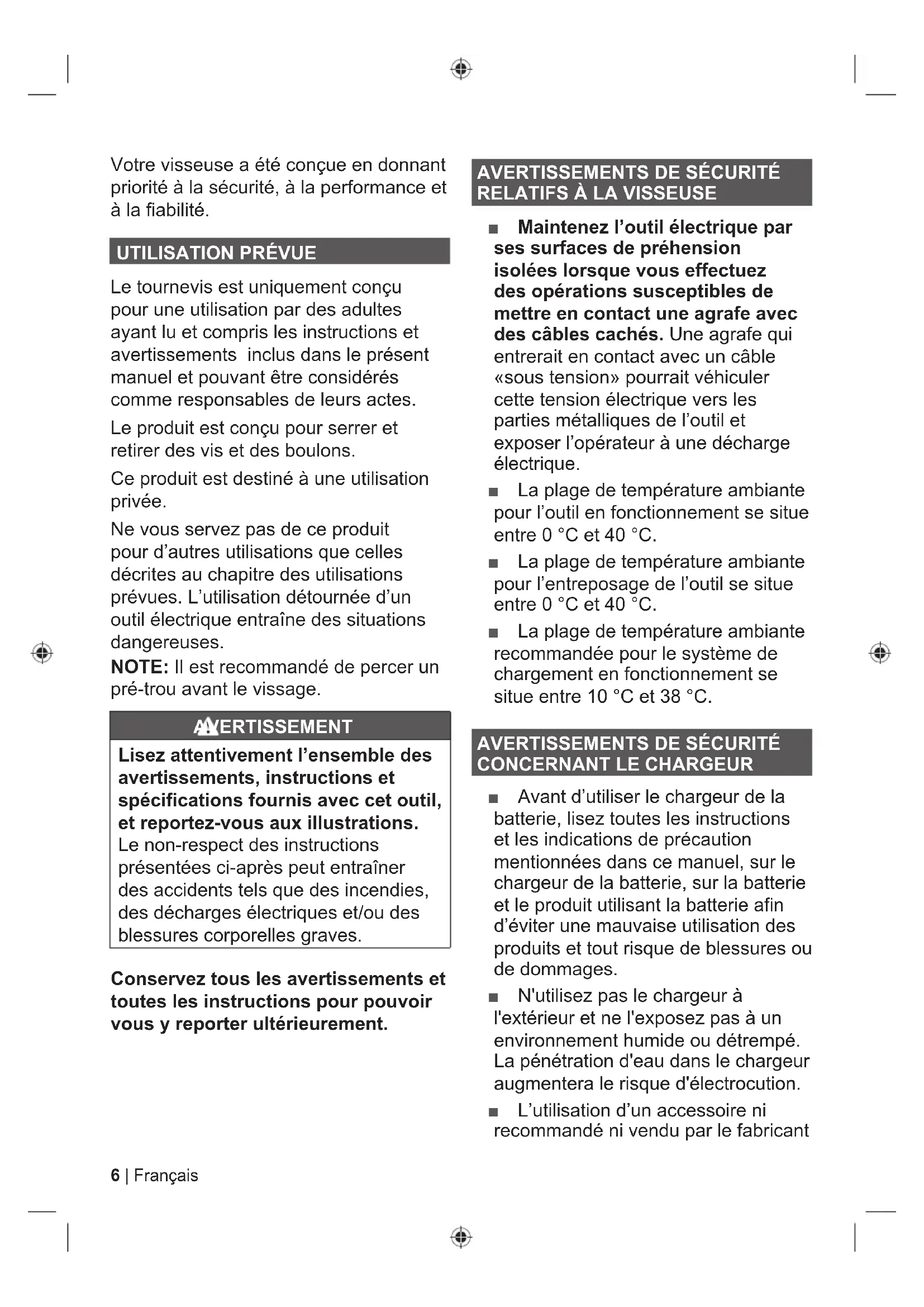 Le tournevis est uniquement conçu pour une utilisation par des adultes ayant lu et compris les instructions et avertissements inclus dans le présent manuel et pouvant être considérés comme responsables de leurs actes. Le produit est conçu pour serrer et retirer des vis et des boulons. Ce produit est destiné à une utilisation privée. Ne vous servez pas de ce produit pour d’autres utilisations que celles décrites au chapitre des utilisations prévues. L’utilisation détournée d’un outil électrique entraîne des situations dangereuses. NOTE: Il est recommandé de percer un pré-trou avant le vissage. AVERTISSEMENT Lisez attentivement l’ensemble des avertissements, instructions et spécifications fournis avec cet outil, et reportez-vous aux illustrations. Le non-respect des instructions présentées ci-après peut entraîner des accidents tels que des incendies, des décharges électriques et/ou des blessures corporelles graves. Conservez tous les avertissements et toutes les instructions pour pouvoir vous y reporter ultérieurement.