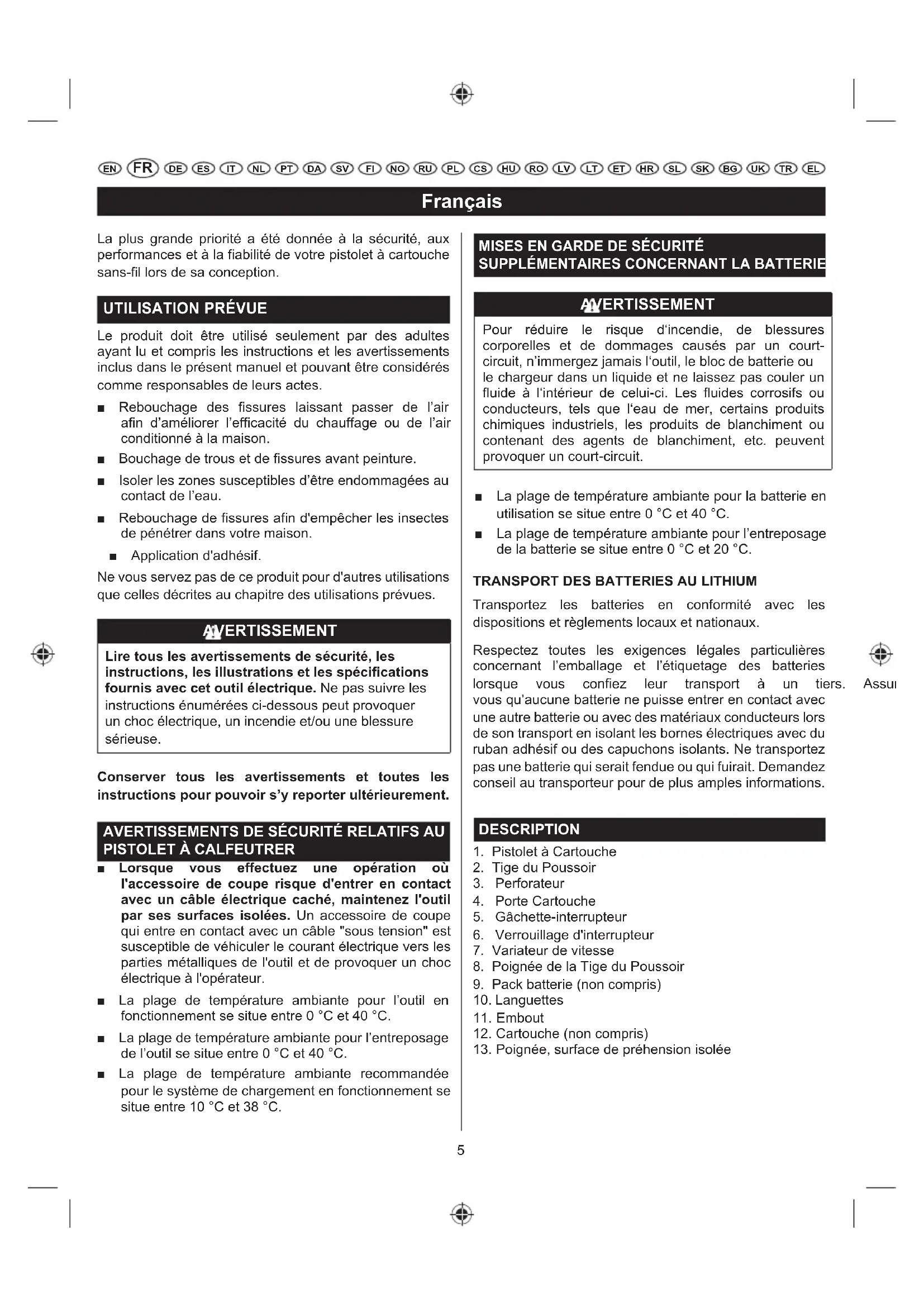 EN DE ES IT NL PT DA SV FI NO RU PL CS HU RO LV LT ET HR SL SK UKBG TR EL La plus grande priorité a été donnée à la sécurité, aux performances et à la fiabilité de votre pistolet à cartouche sans-fil lors de sa conception.