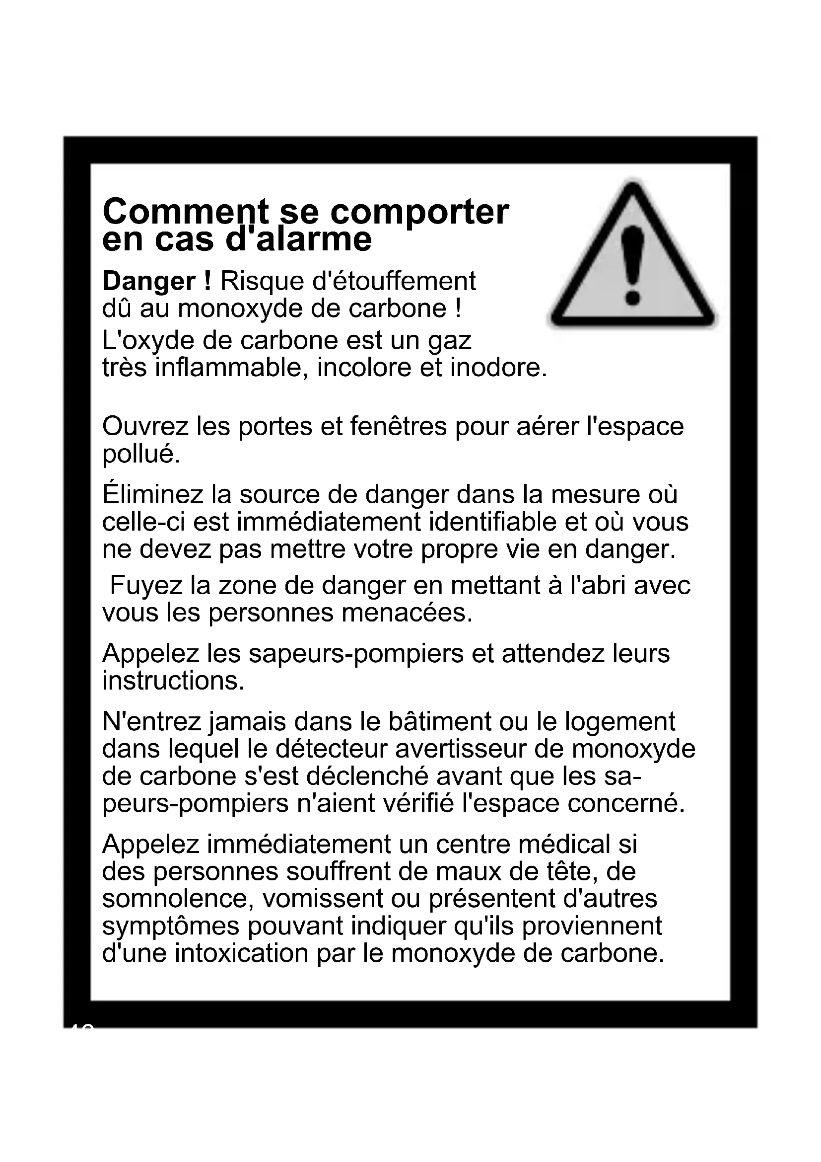 Appuyez sur la touche Test/Hush pour débrancher l'alarme Le détecteur de CO fonctionne maintenant de nouveau normalement, la LED Power clignote toutes les 50 secondes et la LED Alarme est débranchée Avertissement ! Le monoxyde de carbone est un gaz très in ammable, incolore et inodore Power Power Fault Alarm Alarm58 Prenez toute alarme au sérieux Veuillez suivre les instructions au passage Comment se comporter en cas d’alarme Page 48 L'alarme s'arrête quand la concentration de monoxyde de carbone est passée en dessous d'un seuil ne présentant pas de danger Fonction mémoire Si le détecteur de CO a détecté la présence de monoxyde de carbone en votre absence et a déclenché une alarme, la LED Alarme clignote toutes les 15 secondes, puis vous entendez deux bips de signalisation 1 Appuyez sur la touche Test/Hush Le détecteur de CO est prêt à fonctionner, la LED Power clignote toutes les 50 secondes et la LED Alarme est débranchée 2 Prenez les mesures adéquates pour identi er la source de danger qui a provoqué le déclen- chement de l'alarme pendant votre absence et l'éliminer Power Power Test/Hush Test/Hush Test/Hush Test/Hush59 Témoin du niveau de charge des piles Si les piles du détecteur de CO sont presque épuisées, la LED Alarme clignote toutes les 40 secondes, puis vous entendez un bip de signalisation Le détecteur de CO continue de fonctionner sans restriction 1 Remplacez les piles du détecteur par de nouvelles piles du même type dans les 30 jours Vous trouverez d'autres observations aux passages Pose des piles Page 54 et Caractéristiques techniques Page 66 Contrôler le bon fonctionnement Contrôlez régulièrement le bon fonctionnement du détec- teur - au moins une fois par mois 1 Appuyez sur la touche Test/Hush La LED Alarme clignote rapidement et vous entendez un bip de signa- lisation prolongé Si le contrôle indique que le détecteur de CO ne fonctionne pas correctement, une surveillance de la concentration de CO n'est pas garantie Dans ce cas, remplacez sans délai le détecteur de CO60 Autotest Le détecteur de CO effectue un autotest toutes les 10 secondes Si le détecteur de CO reconnaît une erreur, la LED Alarme clignote toutes les 15 secondes, puis vous entendez un bip de signalisation Si l'autotest indique que le détecteur de CO ne fonctionne pas correctement, une surveillance de la concentration de CO n'est pas garantie Dans ce cas, remplacez sans délai le détecteur de CO Expiration de son usage Le détecteur de CO détecte et signale automatiquement le dépassement de sa durée de vie utile La LED Erreur clignote alors toutes les 60 secondes, puis vous entendez trois bips de signalisation Lorsque le détecteur de CO signale l'expiration de sa durée de vie utile, remplacez-le sans délai Power Power Fault Alarm Alarm61 Activer le mode silencieux Activez le mode silencieux si vous désirez débrancher pro- visoirement le signal d'alarme de votre détecteur de CO 1 Appuyez deux fois sur la touche Test/Hush La LED Power et la LED Alarme clignotent simultanément toutes les 10 secondes 2 Si vous voulez terminer le mode silencieux à la main, appuyez sur la touche Test/Hush Vous entendez un bip de signalisation et la LED Power clignote toutes les 50 secondes Le mode silencieux est désactivé Le mode silencieux est par ailleurs désactivé quand