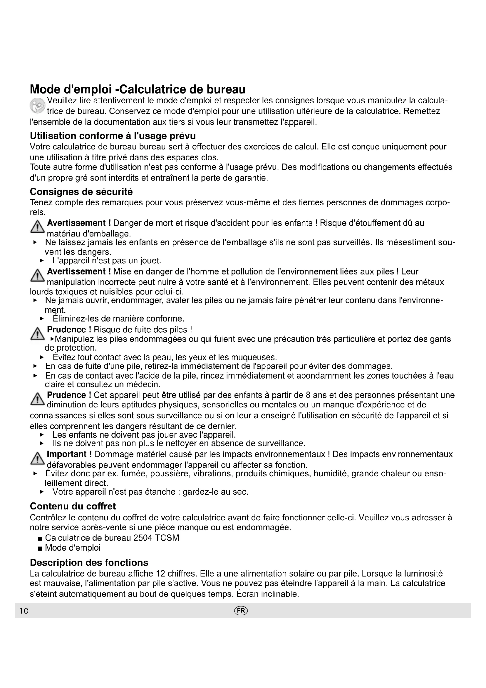 - Votre appareil n'est pas étanche ; gardez-le au sec. Contenu du coret Contrôlez le contenu du coret de votre calculatrice avant de faire fonctionner celle-ci. Veuillez vous adresser à notre service après-vente si une pièce manque ou est endommagée. ■ Calculatrice de bureau 2504 TCSM ■ Mode d'emploi Description des fonctions La calculatrice de bureau ache 12 chires. Elle a une alimentation solaire ou par pile. Lorsque la luminosité est mauvaise, l'alimentation par pile s'active. Vous ne pouvez pas éteindre l'appareil à la main. La calculatrice s'éteint automatiquement au bout de quelques temps. Écran inclinable.11