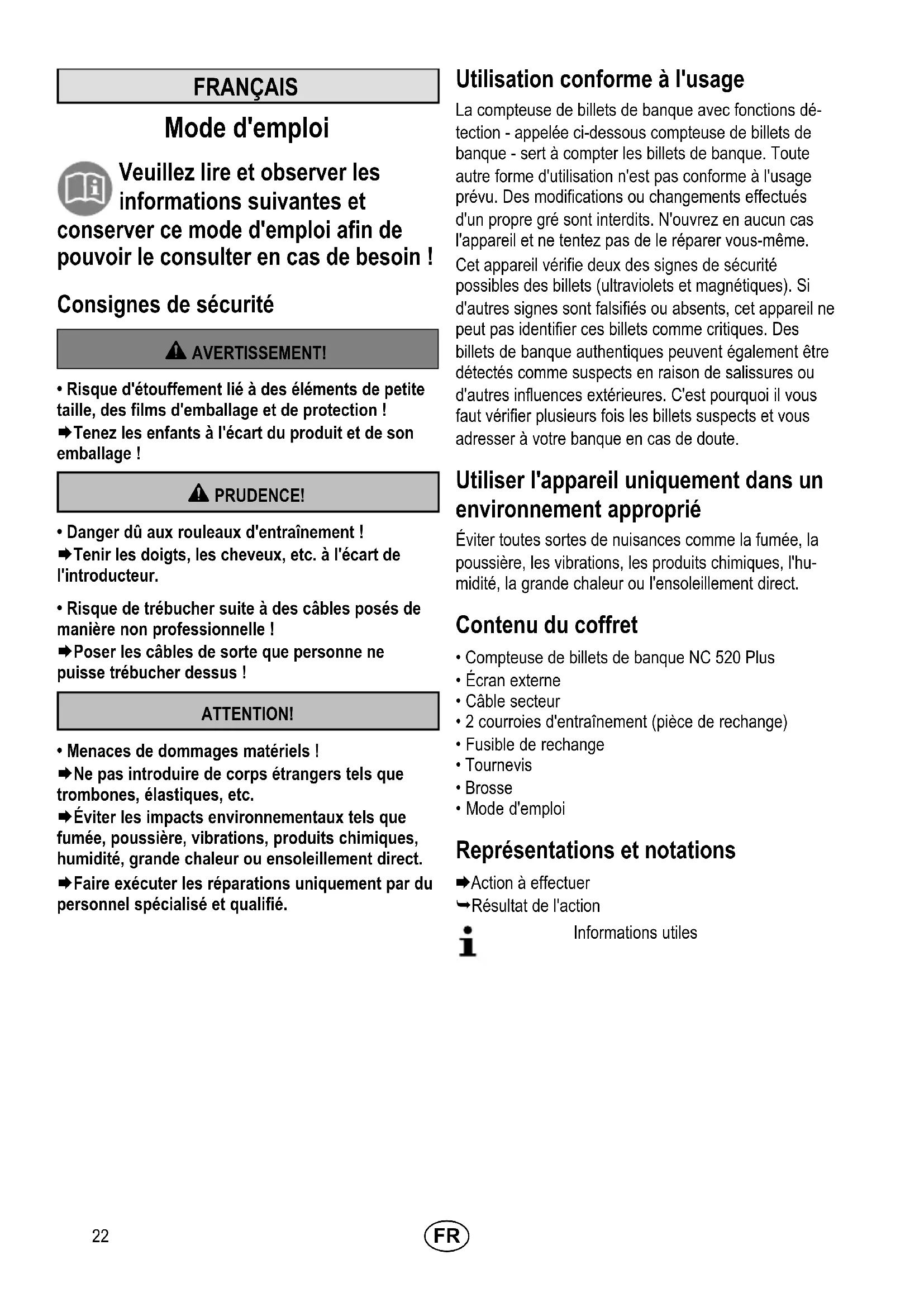 - Menaces de dommages matériels ! Æ Ne pas introduire de corps étrangers tels que trombones, élastiques, etc. Æ Éviter les impacts environnementaux tels que fumée, poussière, vibrations, produits chimiques, humidité, grande chaleur ou ensoleillement direct. Æ Faire exécuter les réparations uniquement par du personnel spécialisé et qualifié. Utilisation conforme à l'usage La compteuse de billets de banque avec fonctions dé tection - appelée ci-dessous compteuse de billets de banque - sert à compter les billets de banque. Toute autre forme d'utilisation n'est pas conforme à l'usage prévu. Des modifications ou changements effectués d'un propre gré sont interdits. N'ouvrez en aucun cas l'appareil et ne tentez pas de le réparer vous-même. Cet appareil vérifie deux des signes de sécurité possibles des billets (ultraviolets et magnétiques). Si d'autres signes sont falsifiés ou absents, cet appareil ne peut pas identifier ces billets comme critiques. Des billets de banque authentiques peuvent également être détectés comme suspects en raison de salissures ou d'autres influences extérieures. C'est pourquoi il vous faut vérifier plusieurs fois les billets suspects et vous adresser à votre banque en cas de doute. Utiliser l'appareil uniquement dans un environnement approprié Éviter toutes sortes de nuisances comme la fumée, la poussière, les vibrations, les produits chimiques, l'hu midité, la grande chaleur ou l'ensoleillement direct. Contenu du coffret