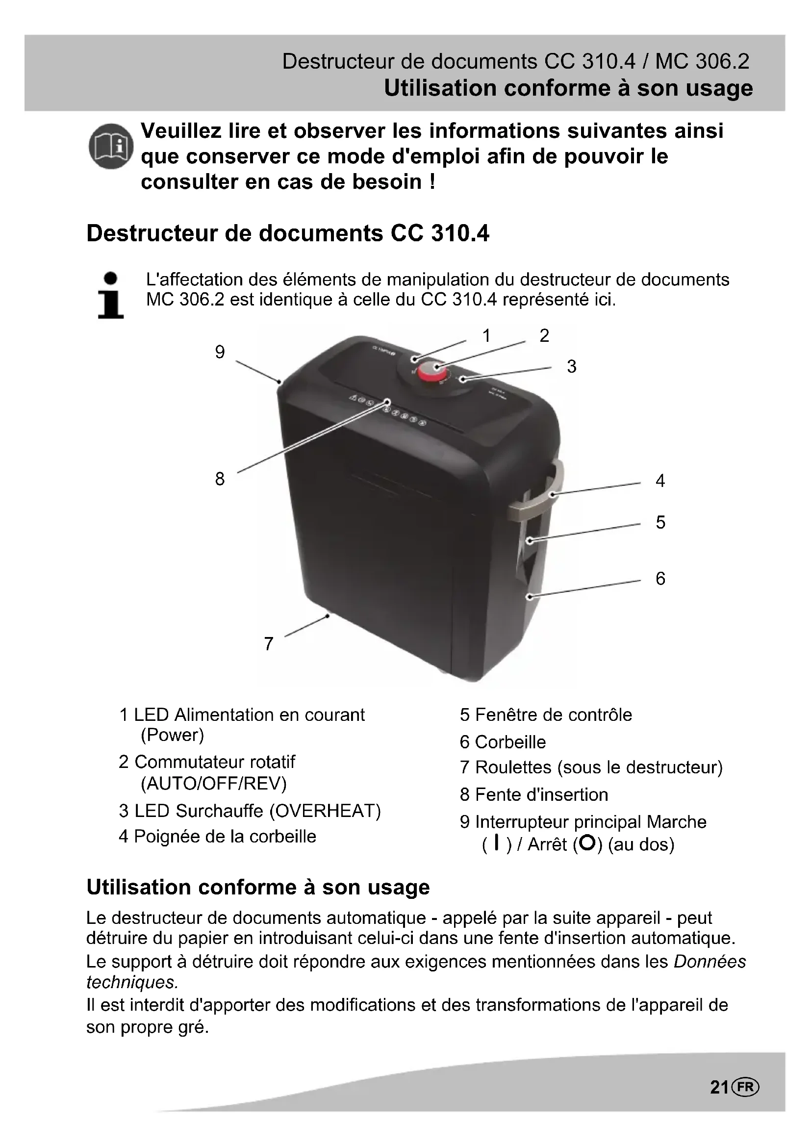 1 LED Alimentation en courant (Power) 2 Commutateur rotatif (AUTO/OFF/REV) 3 LED Surchauffe (OVERHEAT) 4 Poignée de la corbeille 5 Fenêtre de contrôle 6 Corbeille 7 Roulettes (sous le destructeur) 8 Fente d'insertion 9 Interrupteur principal Marche (⏽) / Arrêt (⭘) (au dos) Utilisation conforme à son usage Le destructeur de documents automatique - appelé par la suite appareil - peut détruire du papier en introduisant celui-ci dans une fente d'insertion automatique. Le support à détruire doit répondre aux exigences mentionnées dans les Données techniques. Il est interdit d'apporter des modifications et des transformations de l'appareil de son propre gré.Consignes de sécurité Destructeur de documents CC 310.4 / MC 306.2 22 F N'ouvrez en aucun cas l'appareil et ne le réparez pas vous-même. Utilisation non conforme à son usage Le destructeur de documents automatique ne sert pas à détruire des supports ne répondant pas aux exigences indiquées dans les Données techniques, par ex. du carton. Toute utilisation autre que celle décrite dans Utilisation conforme à son usage est considérée comme non conforme. Consignes de sécurité Les consignes de sécurité suivantes sont valables pour l'ensemble du document. Veuillez les lire et en tenir compte pour vous protéger ainsi que respecter l'environnement.