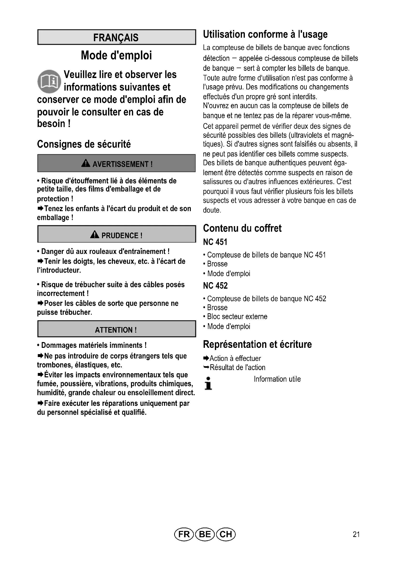 - Dommages matériels imminents ! Æ Ne pas introduire de corps étrangers tels que trombones, élastiques, etc. Æ Éviter les impacts environnementaux tels que fumée, poussière, vibrations, produits chimiques, humidité, grande chaleur ou ensoleillement direct. Æ Faire exécuter les réparations uniquement par du personnel spécialisé et qualifié. Utilisation conforme à l'usage La compteuse de billets de banque avec fonctions détection – appelée ci-dessous compteuse de billets de banque – sert à compter les billets de banque. Toute autre forme d'utilisation n'est pas conforme à l'usage prévu. Des modifications ou changements effectués d'un propre gré sont interdits. N'ouvrez en aucun cas la compteuse de billets de banque et ne tentez pas de la réparer vous-même. Cet appareil permet de vérifier deux des signes de sécurité possibles des billets (ultraviolets et magné tiques). Si d'autres signes sont falsifiés ou absents, il ne peut pas identifier ces billets comme suspects. Des billets de banque authentiques peuvent éga lement être détectés comme suspects en raison de salissures ou d'autres influences extérieures. C'est pourquoi il vous faut vérifier plusieurs fois les billets suspects et vous adresser à votre banque en cas de doute. Contenu du coffret NC 451