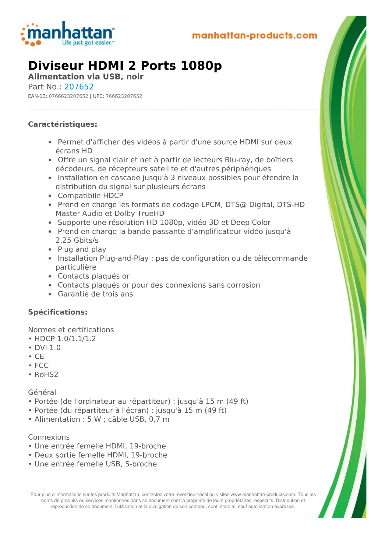 Diviseur HDMI 2 Ports 1080p Alimentation via USB, noir Part No.: 207652 EAN-13: 0766623207652 | UPC: 766623207652 Caractéristiques: Permet d'afficher des vidéos à partir d'une source HDMI sur deux écrans HD Offre un signal clair et net à partir de lecteurs Blu-ray, de boîtiers décodeurs, de récepteurs satellite et d'autres périphériques Installation en cascade jusqu'à 3 niveaux possibles pour étendre la distribution du signal sur plusieurs écrans Compatibile HDCP Prend en charge les formats de codage LPCM, DTS@ Digital, DTS-HD Master Audio et Dolby TrueHD Supporte une résolution HD 1080p, vidéo 3D et Deep Color Prend en charge la bande passante d'amplificateur vidéo jusqu'à 2,25 Gbits/s Plug and play Installation Plug-and-Play : pas de configuration ou de télécommande particulière Contacts plaqués or Contacts plaqués or pour des connexions sans corrosion Garantie de trois ans Spécifications: Normes et certifications