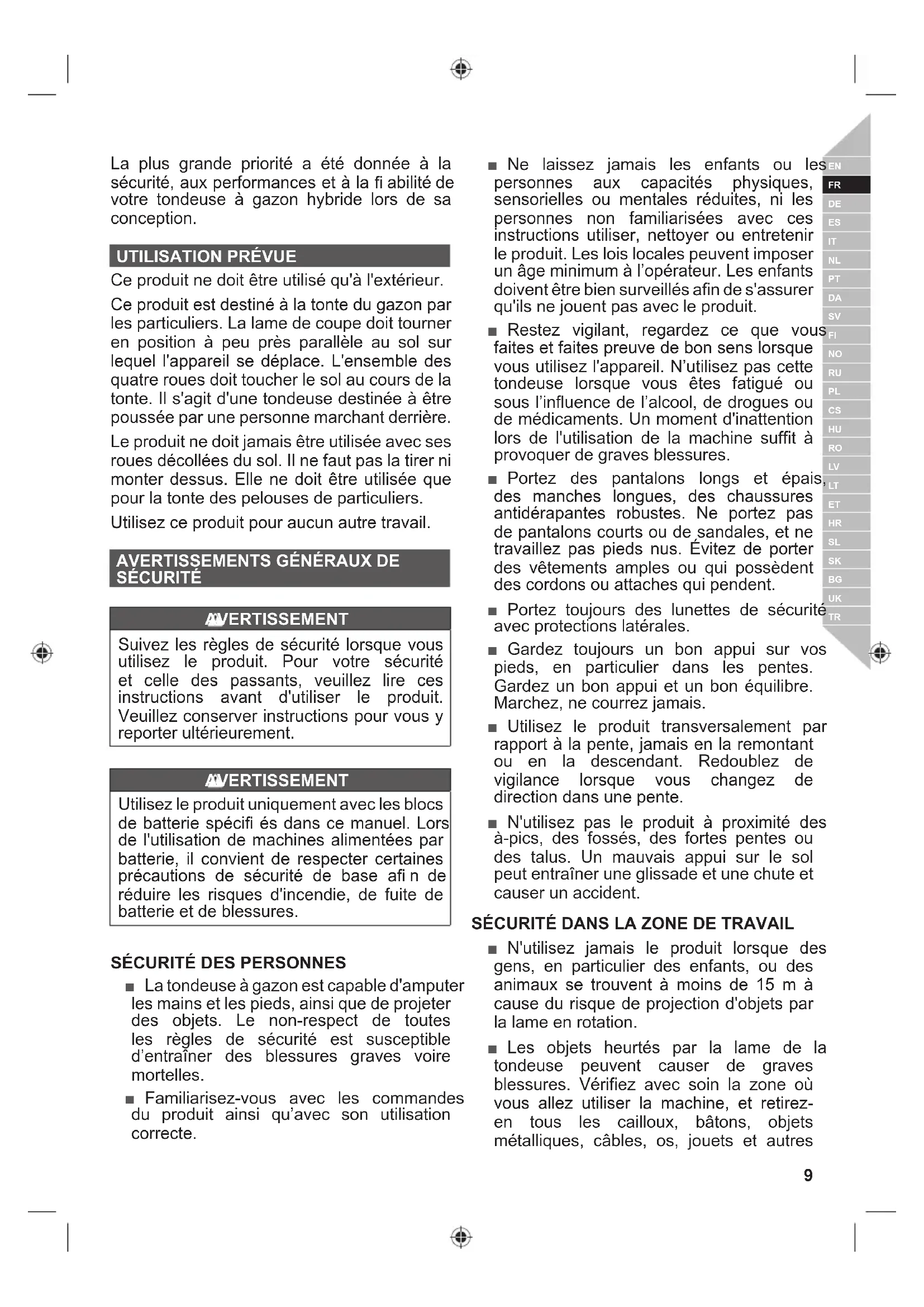 ■ La tondeuse à gazon est capable d'amputer les mains et les pieds, ainsi que de projeter des objets. Le non-respect de toutes les règles de sécurité est susceptible d’entraîner des blessures graves voire mortelles. ■ Familiarisez-vous avec les commandes du produit ainsi qu’avec son utilisation correcte. ■ Ne laissez jamais les enfants ou les personnes aux capacités physiques, sensorielles ou mentales réduites, ni les personnes non familiarisées avec ces instructions utiliser, nettoyer ou entretenir le produit. Les lois locales peuvent imposer un âge minimum à l’opérateur. Les enfants doivent être bien surveillés afin de s'assurer qu'ils ne jouent pas avec le produit. ■ Restez vigilant, regardez ce que vous faites et faites preuve de bon sens lorsque vous utilisez l'appareil. N’utilisez pas cette tondeuse lorsque vous êtes fatigué ou sous l’influence de l’alcool, de drogues ou de médicaments. Un moment d'inattention lors de l'utilisation de la machine suffit à provoquer de graves blessures. ■ Portez des pantalons longs et épais, des manches longues, des chaussures antidérapantes robustes. Ne portez pas de pantalons courts ou de sandales, et ne travaillez pas pieds nus. Évitez de porter des vêtements amples ou qui possèdent des cordons ou attaches qui pendent. ■ Portez toujours des lunettes de sécurité avec protections latérales. ■ Gardez toujours un bon appui sur vos pieds, en particulier dans les pentes. Gardez un bon appui et un bon équilibre. Marchez, ne courrez jamais. ■ Utilisez le produit transversalement par rapport à la pente, jamais en la remontant ou en la descendant. Redoublez de vigilance lorsque vous changez de direction dans une pente. ■ N'utilisez pas le produit à proximité des à-pics, des fossés, des fortes pentes ou des talus. Un mauvais appui sur le sol peut entraîner une glissade et une chute et causer un accident. SÉCURITÉ DANS LA ZONE DE TRAVAIL ■ N'utilisez jamais le produit lorsque des gens, en particulier des enfants, ou des animaux se trouvent à moins de 15 m à cause du risque de projection d'objets par la lame en rotation. ■ Les objets heurtés par la lame de la tondeuse peuvent causer de graves blessures. Vérifiez avec soin la zone où vous allez utiliser la machine, et retirez- en tous les cailloux, bâtons, objets métalliques, câbles, os, jouets et autres 9 Français |