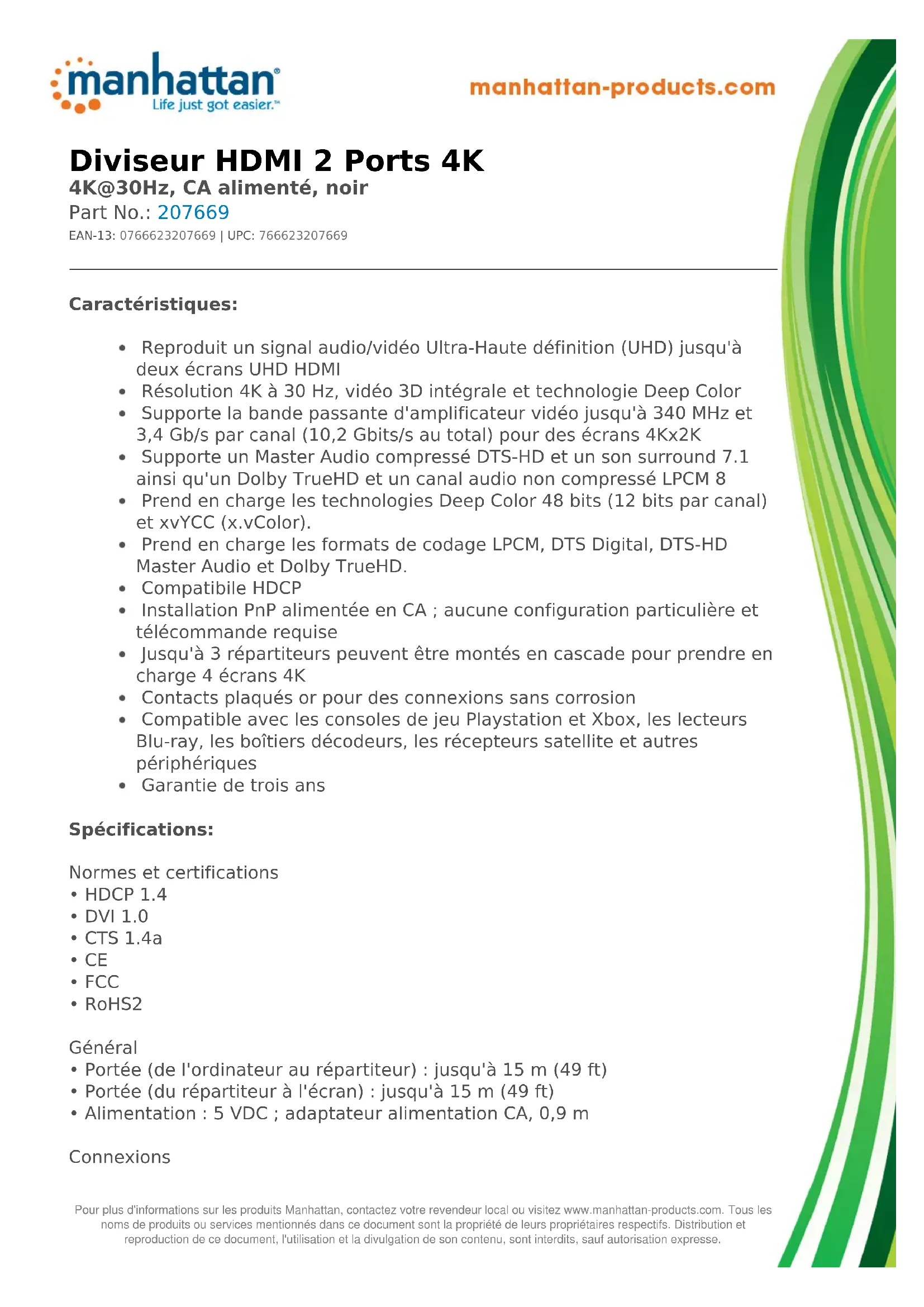 Oui, le répartiteur MANHATTAN 207669 est généralement couvert par une garantie limitée. Vérifiez les détails spécifiques auprès du revendeur ou sur le site du fabricant.