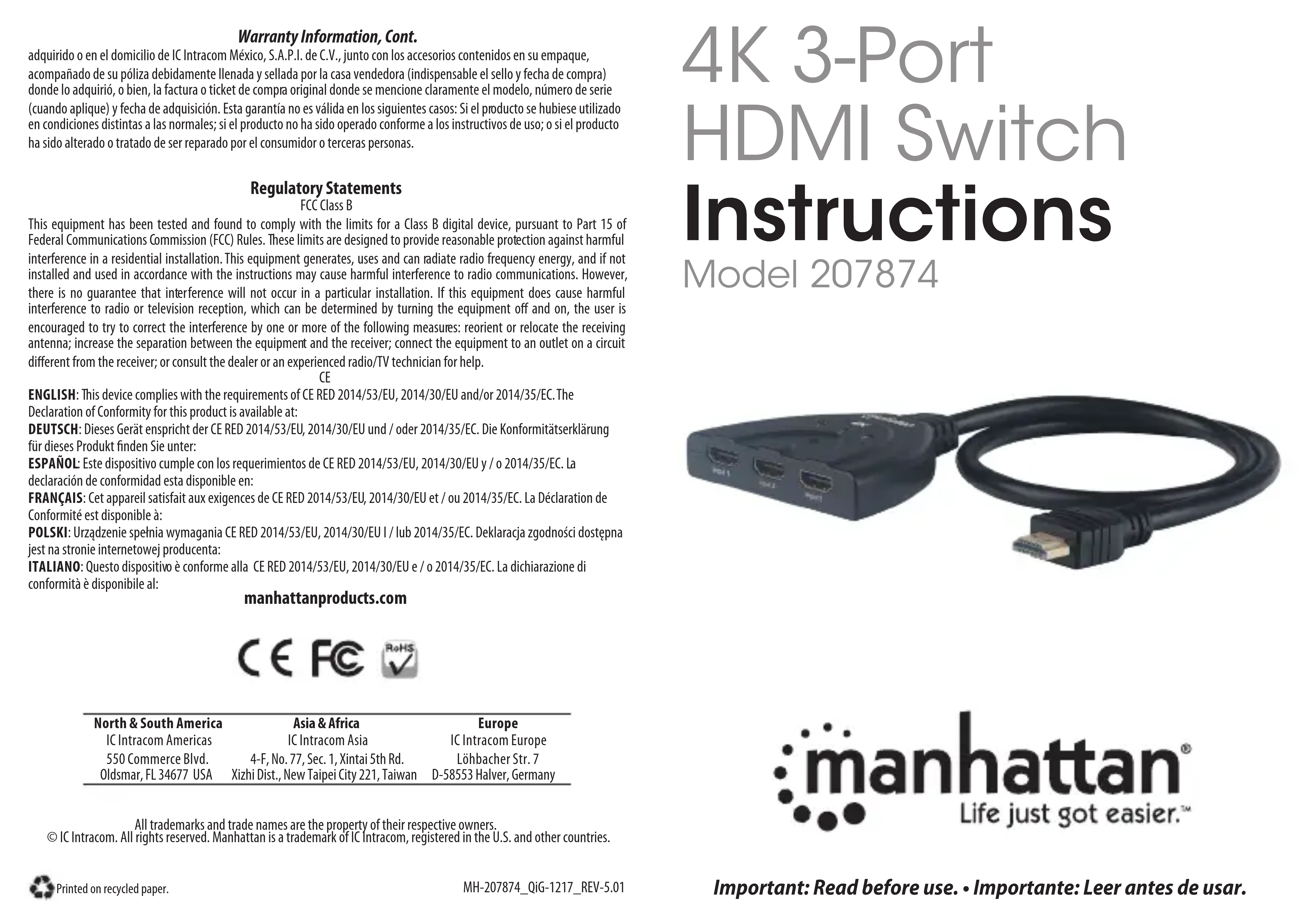 Téléchargez la notice de votre Commutateur HDMI au format PDF gratuitement ! Retrouvez votre notice 207874 - MANHATTAN et reprennez votre appareil électronique en main. Sur cette page sont publiés tous les documents nécessaires à l'utilisation de votre appareil 207874 de la marque MANHATTAN.