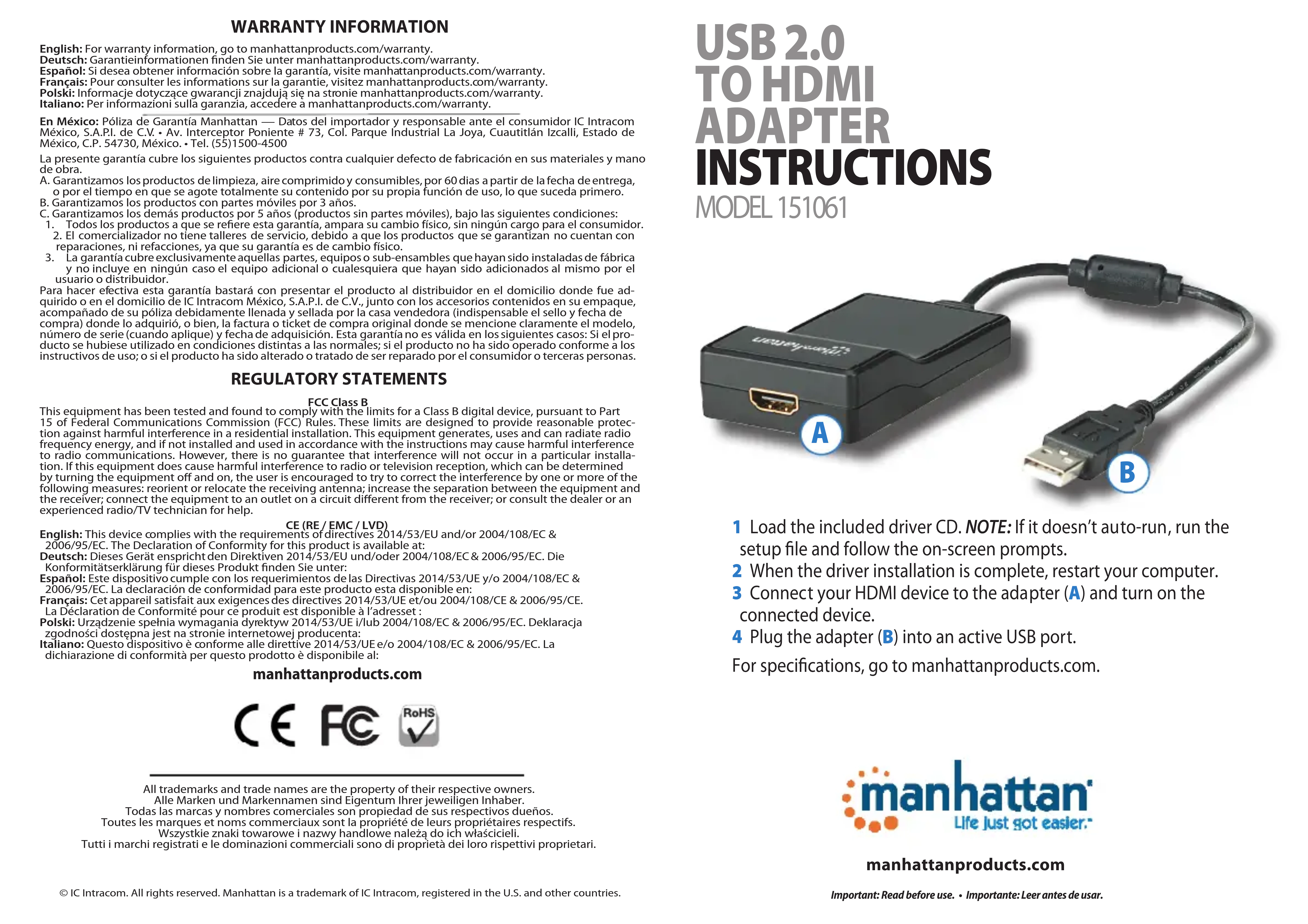 Conecte su dispositivo HDMI al adaptador (A) y encienda el dispositivo conectado. 4 Conecte el adaptador (B) en un puerto USB activo. Para más especificaciones, visite manhattanproducts.com. Français Adaptateur USB 2.0 vers HDMI 1 Insérez le CD de pilote inclus. REMARQUE: Si l’installation ne commence pas automatiquement, lancez le fichier “Setup” manuellement, puis suivez les instructions. 2 Dès que l’installation est complète, redémarrez votre ordinateur. 3 Connectez votre dispositif HDMI à l’adaptateur (