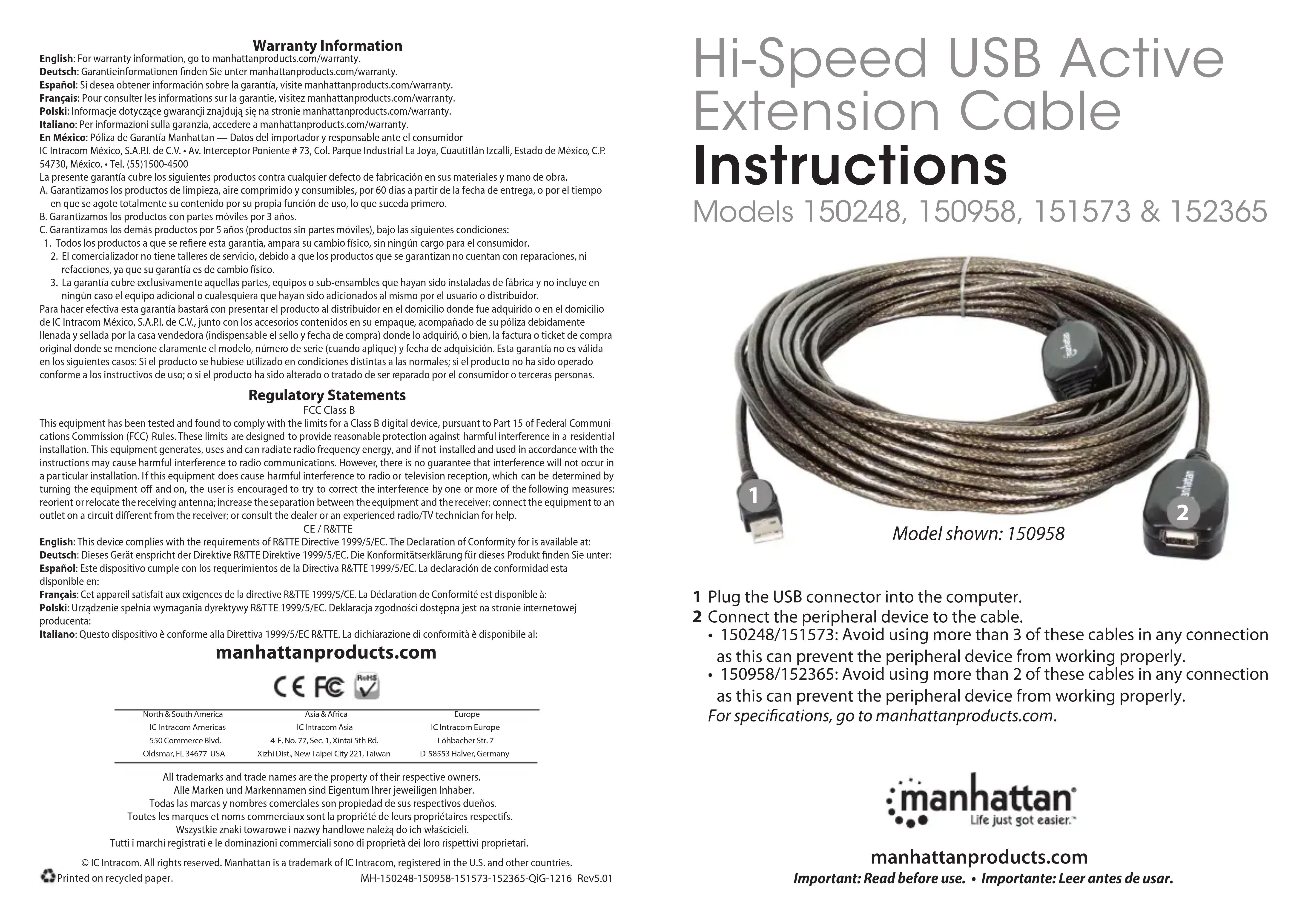 - 150958/152365: Évitez d’utiliser plus que 2 rallonges actives dans chaque connexion comme cela peut empêcher que le dispositif périphérique marche proprement. Vous trouvez les spécications sur manhattanproducts.com.