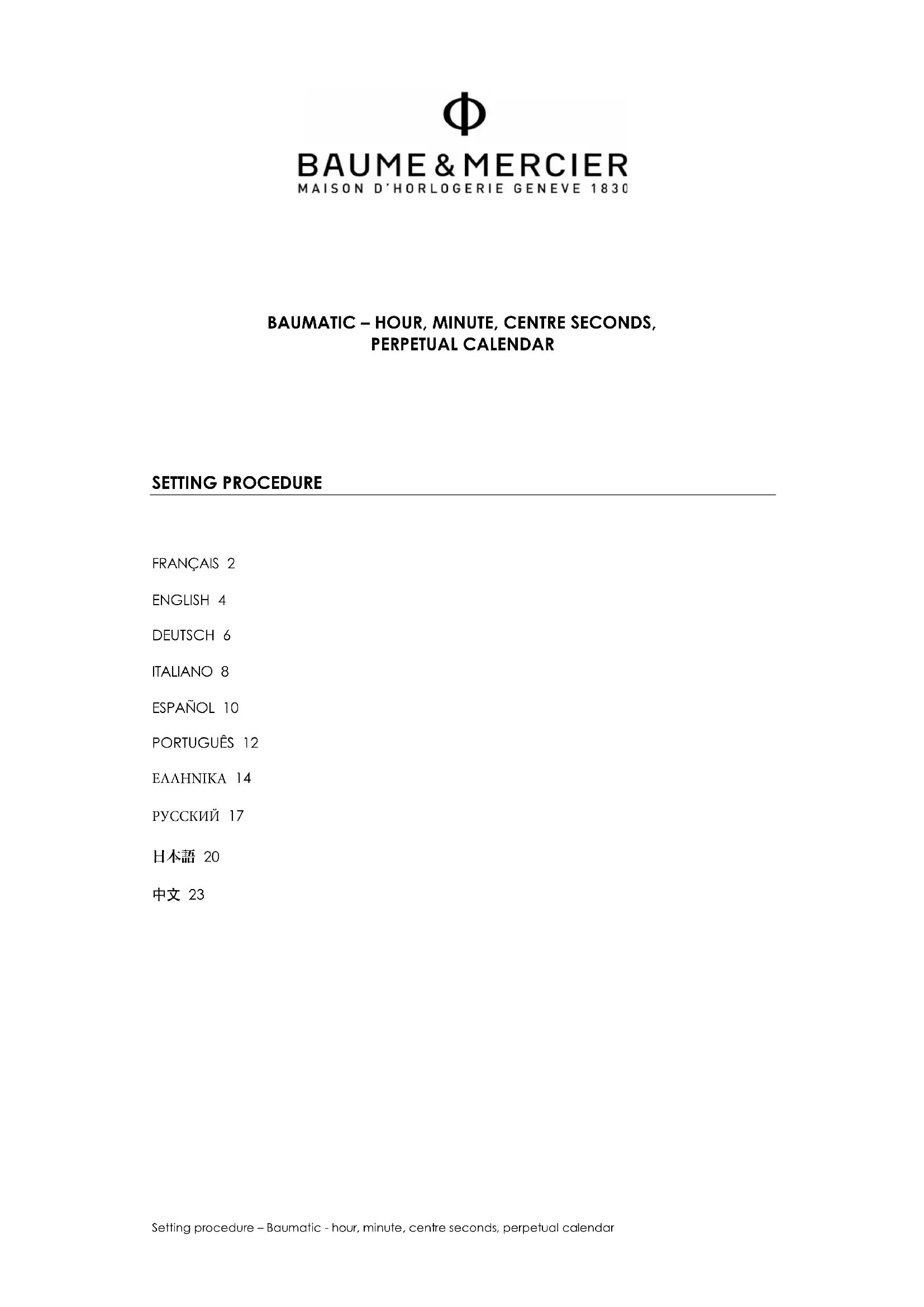 INFORMATIONS GENERALES Conseils d’entretien Un soin particulier a été apporté à la conception et à la fabrication de votre montre Baume & Mercier. Nous vous invitons à lire nos recommandations d’usage et d’entretien sur www.baume-et-mercier.com. Garantie Internationale Votre montre Baume & Mercier est couverte par la Garantie Internationale Baume & Mercier. Les conditions de la Garantie Internationale Baume & Mercier sont disponibles sur www.baume-et- mercier.com/customer-service/warranty.html. Autres renseignements Pour toute question que vous pourriez avoir, nous vous invitons à consulter notre site internet www.baume-et-mercier.com. Vous pouvez également contacter nos détaillants agréés dans votre pays (liste disponible sur notre site internet www.baume-et-mercier.com) ou nous contacter directement par le biais de notre site internet en utilisant le formulaire de contact ou en appelant l’un de nos Centres de Relation Clients (www.baume- et-mercier.com/customer-service/contact-us.html).Setting procedure – Baumatic - hour, minute, centre seconds, perpetual calendar 4 BAUMATIC – HOUR, MINUTE, CENTRE SECONDS, PERPETUAL CALENDAR