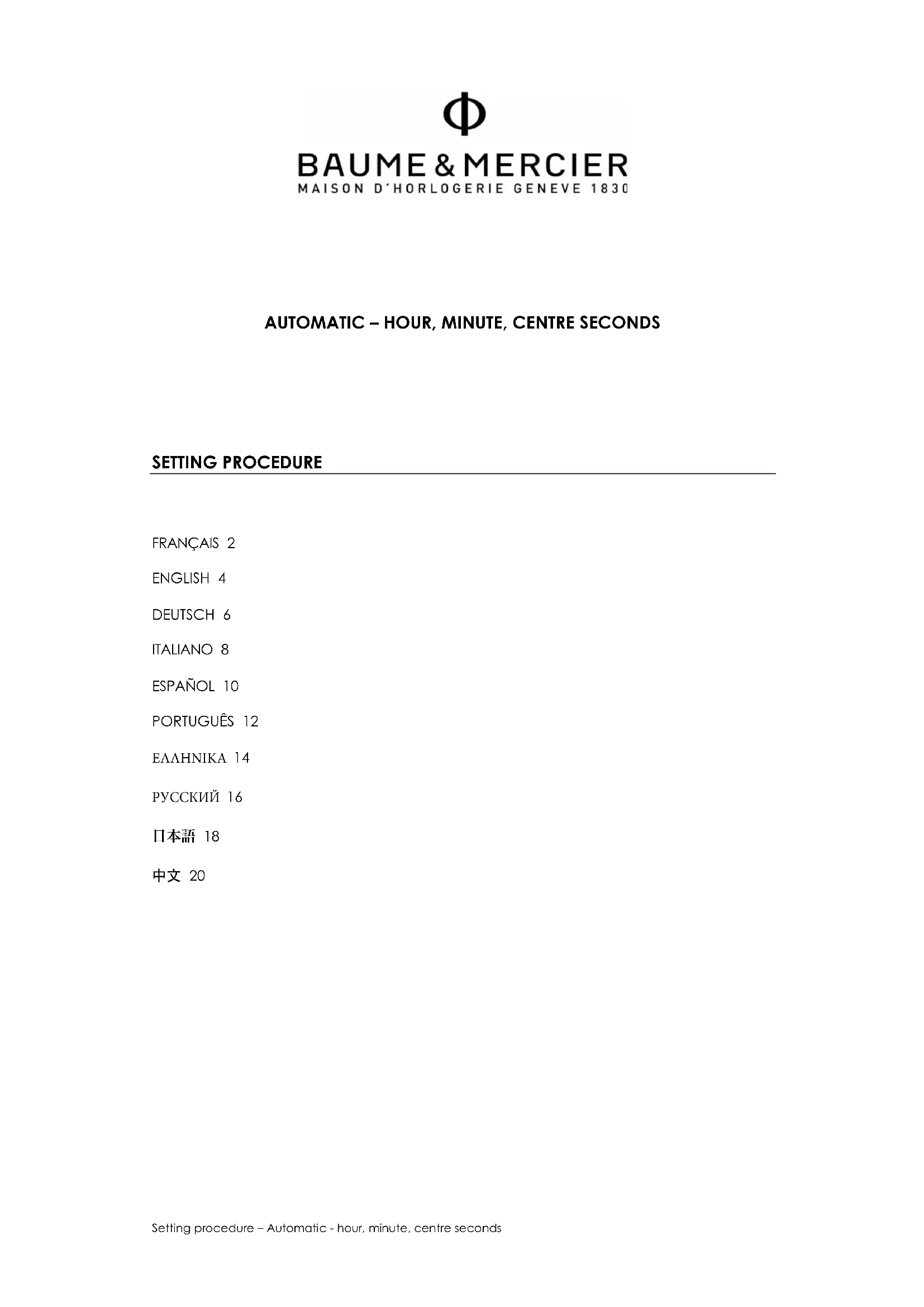 INFORMATIONS GENERALES Conseils d’entretien Un soin particulier a été apporté à la conception et à la fabrication de votre montre Baume & Mercier. Nous vous invitons à lire nos recommandations d’usage et d’entretien sur www.baume-et-mercier.com. Garantie Internationale Votre montre Baume & Mercier est couverte par la Garantie Internationale Baume & Mercier. Les conditions de la Garantie Internationale Baume & Mercier sont disponibles sur www.baume-et- mercier.com/customer-service/warranty.html. Autres renseignements Pour toute question que vous pourriez avoir, nous vous invitons à consulter notre site internet www.baume-et-mercier.com. Vous pouvez également contacter nos détaillants agréés dans votre pays (liste disponible sur notre site internet www.baume-et-mercier.com) ou nous contacter directement par le biais de notre site internet en utilisant le formulaire de contact ou en appelant l’un de nos Centres de Relation Clients (www.baume- et-mercier.com/customer-service/contact-us.html).Setting procedure – Automatic - hour, minute, centre seconds 4