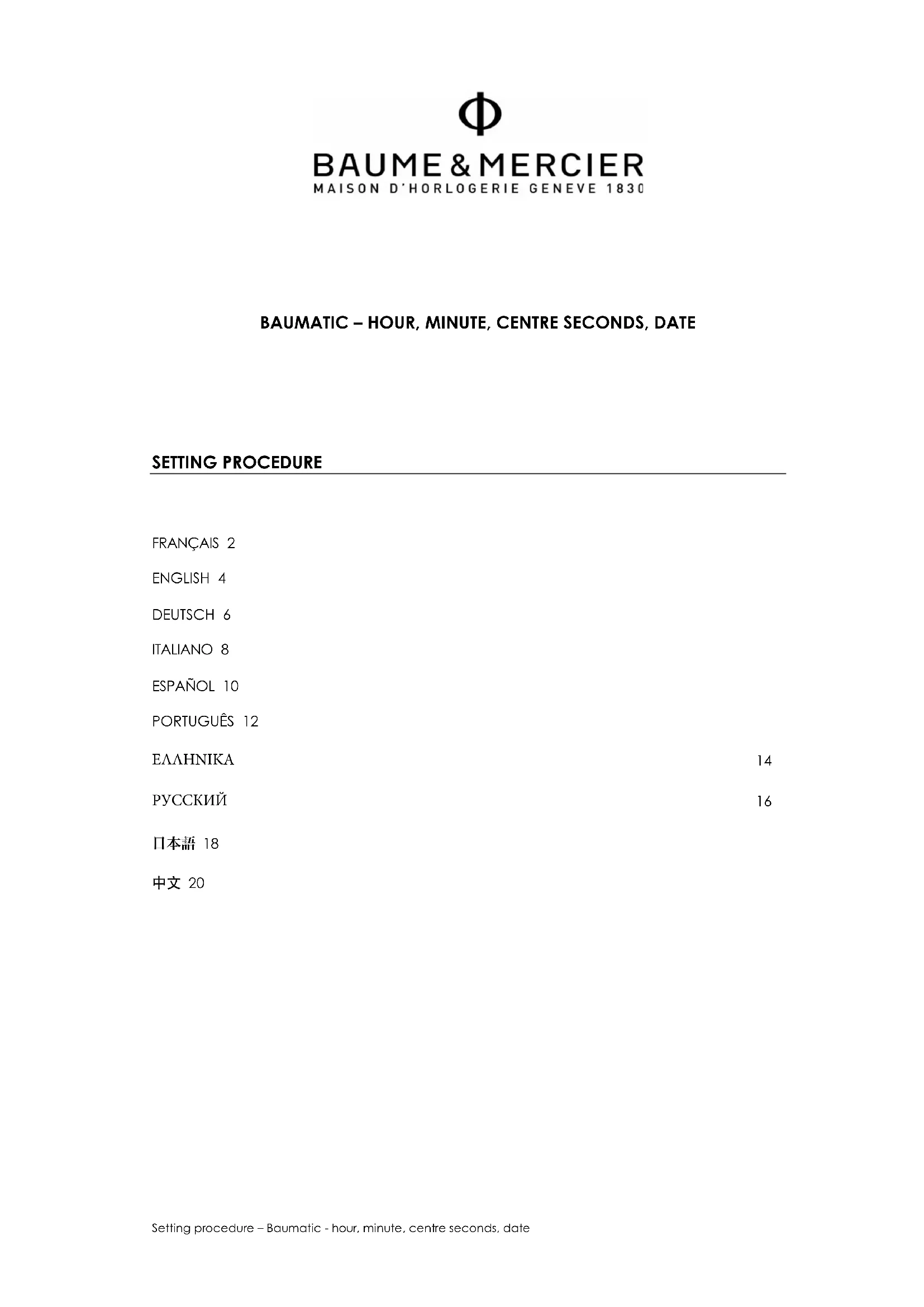 Pour les mois de moins de 31 jours, il est nécessaire de changer la date manuellement en fin de mois. INFORMATIONS GENERALES Conseils d’entretien Un soin particulier a été apporté à la conception et à la fabrication de votre montre Baume & Mercier. Nous vous invitons à lire nos recommandations d’usage et d’entretien sur www.baume-et-mercier.com. Garantie Internationale Votre montre Baume & Mercier est couverte par la Garantie Internationale Baume & Mercier. Les conditions de la Garantie Internationale Baume & Mercier sont disponibles sur www.baume-et- mercier.com/customer-service/warranty.html. Autres renseignements Pour toute question que vous pourriez avoir, nous vous invitons à consulter notre site internet www.baume-et-mercier.com. Vous pouvez également contacter nos détaillants agréés dans votre pays (liste disponible sur notre site internet www.baume-et-mercier.com) ou nous contacter directement par le biais de notre site internet en utilisant le formulaire de contact ou en appelant l’un de nos Centres de Relation Clients (www.baume- et-mercier.com/customer-service/contact-us.html).Setting procedure – Baumatic - hour, minute, centre seconds, date 4