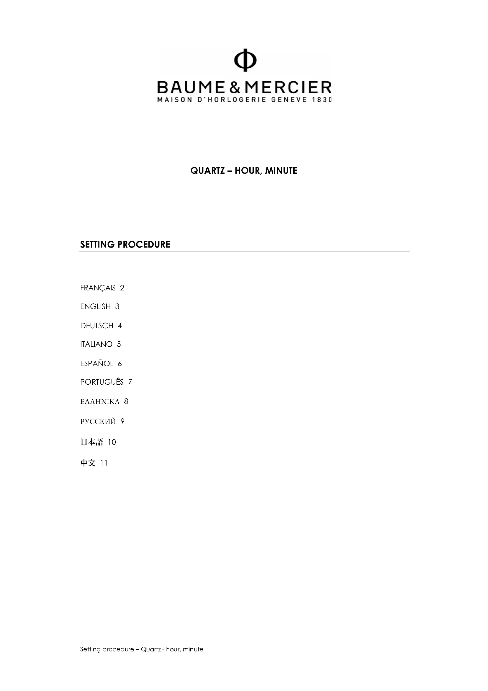Les montres à quartz contiennent une batterie et des éléments électroniques. Lors d’un entretien, votre Centre de Service Après-Vente ou un détaillant agréé Baume & Mercier se chargera de les récupérer et de procéder à leur élimination selon les normes en vigueur. Ce symbole indique que ce produit ne doit pas être jeté dans les ordures ménagères. Il doit être remis à un point de collecte agréé. En effectuant cette démarche, vous contribuerez à la protection de l’environnement et de la santé humaine. Le recyclage des matériaux permettra de conserver des ressources naturelles. *Applicable dans les pays membres de la Communauté Européenne et dans les pays disposant d’une législation comparable. Note : Depuis 2011, toutes les piles utilisées dans les montres Baume & Mercier sont sans mercure. Autres renseignements Pour toute question que vous pourriez avoir, nous vous invitons à consulter notre site internet www.baume-et-mercier.com. Vous pouvez également contacter nos détaillants agréés dans votre pays (liste disponible sur notre site internet www.baume-et-mercier.com) ou nous contacter directement par le biais de notre site internet en utilisant le formulaire de contact ou en appelant l’un de nos Centres de Relation Clients (www.baume- et-mercier.com/customer-service/contact-us.html).Setting procedure – Quartz - hour, minute 3