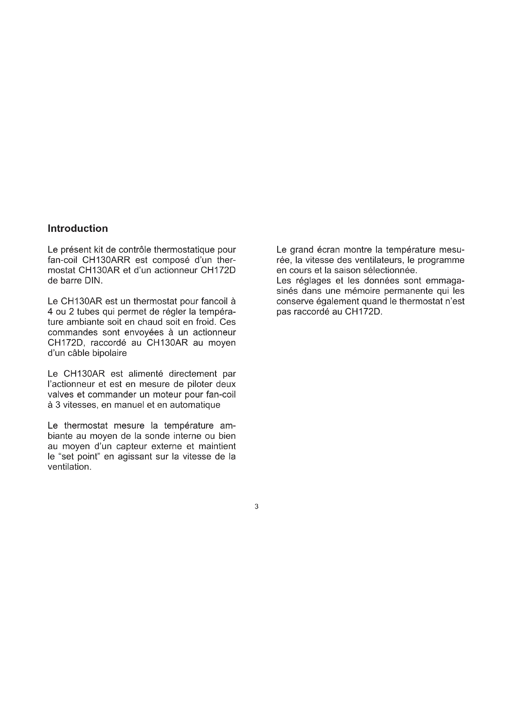 - Fixation du thermostat sur le socle Introduction Le présent kit de contrôle thermostatique pour fan-coil CH130ARR est composé d’un ther- mostat CH130AR et d’un actionneur CH172D de barre DIN. Le CH130AR est un thermostat pour fancoil à 4 ou 2 tubes qui permet de régler la tempéra- ture ambiante soit en chaud soit en froid. Ces commandes sont envoyées à un actionneur CH172D, raccordé au CH130AR au moyen d’un câble bipolaire Le CH130AR est alimenté directement par l’actionneur et est en mesure de piloter deux valves et commander un moteur pour fan-coil à 3 vitesses, en manuel et en automatique Le thermostat mesure la température am- biante au moyen de la sonde interne ou bien au moyen d’un capteur externe et maintient le “set point” en agissant sur la vitesse de la ventilation. Le grand écran montre la température mesu- rée, la vitesse des ventilateurs, le programme en cours et la saison sélectionnée. Les réglages et les données sont emmaga- sinés dans une mémoire permanente qui les conserve également quand le thermostat n’est pas raccordé au CH172D.4 Indications p. 103