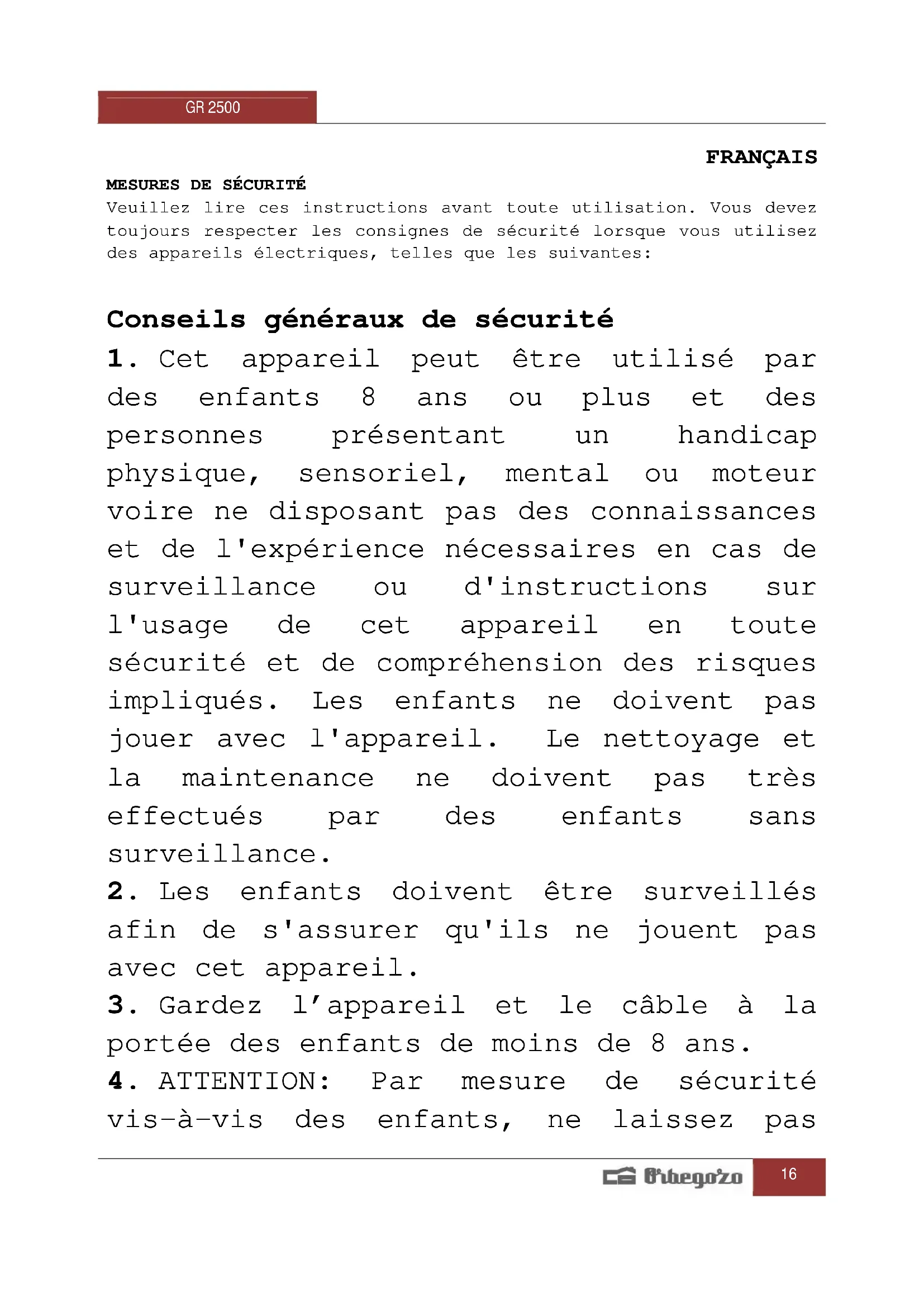 - Ne laissez pas l'appareil fonctionner sans surveillance.GR 2500