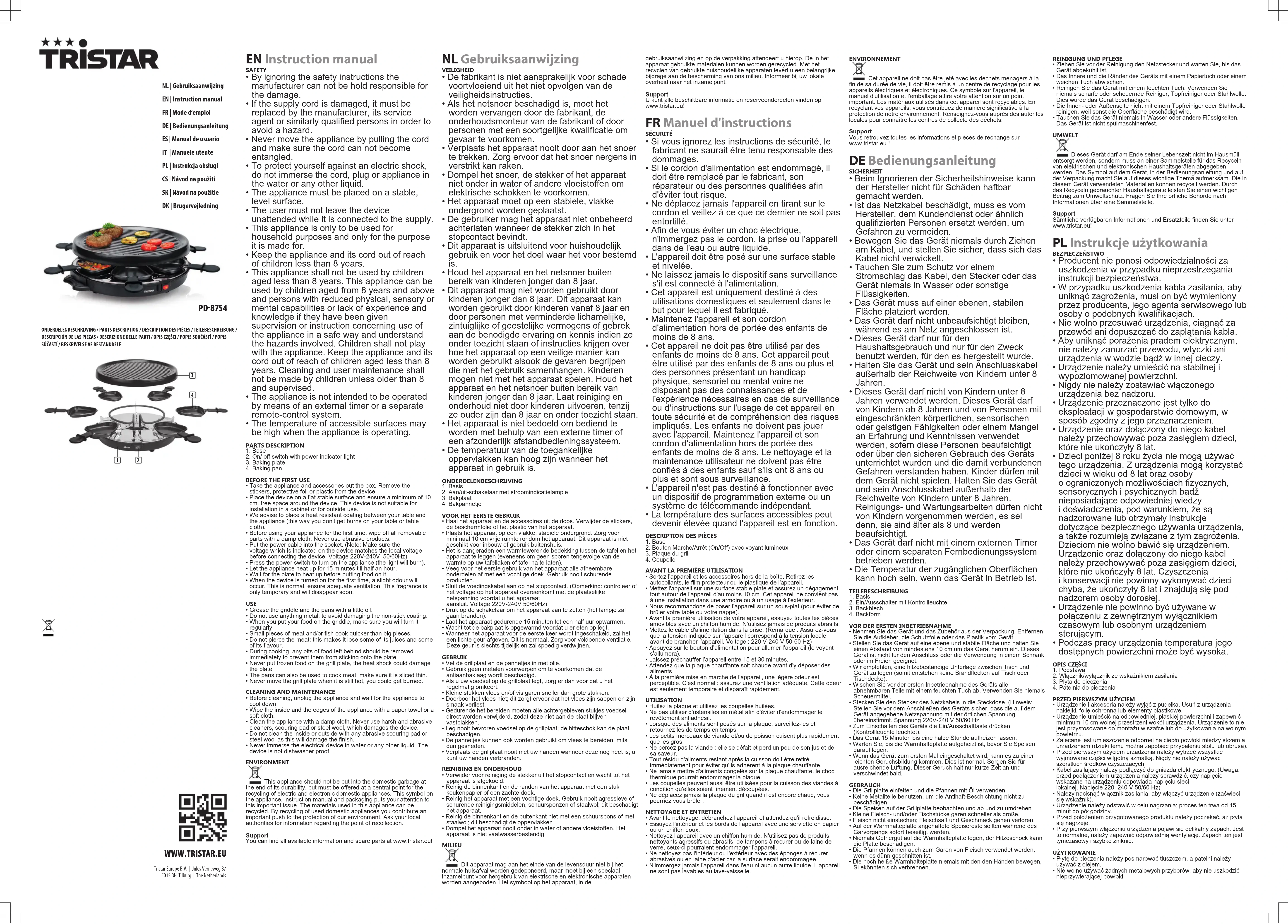 - La température des surfaces accessibles peut devenir élevée quand l'appareil est en fonction. DESCRIPTION DES PIÈCES1. Base2. Bouton Marche/Arrêt (On/Off) avec voyant lumineux3. Plaque du grill4. CoupelleAVANT LA PREMIÈRE UTILISATION• Sortez l'appareil et les accessoires hors de la boîte.Retirez lesautocollants, le film protecteur ou le plastique de l'appareil.• Mettez l'appareil sur une surface stable plate et assurez un dégagementtout autour de l'appareil d'au moins 10 cm. Cet appareil ne convient pasà une installation dans une armoire ou à un usage à l'extérieur.• Nous recommandons de poser l’appareil sur un sous-plat (pour éviter debrûler votre table ou votre nappe).• Avant la première utilisation de votre appareil, essuyez toutes les piècesamovibles avec un chiffon humide. N’utilisez jamais de produits abrasifs.• Mettez le câble d'alimentation dans la prise.(Remarque : Assurez-vousque la tension indiquée sur l'appareil correspond à la tension localeavant de brancher l'appareil.Voltage : 220 V-240 V 50-60 Hz)• Appuyez sur le bouton d’alimentation pour allumer l’appareil (le voyants’allumera).• Laissez préchauffer l’appareil entre 15 et 30 minutes.• Attendez que la plaque chauffante soit chaude avant d’y déposer desaliments.• À la première mise en marche de l'appareil, une légère odeur estperceptible. C'est normal : assurez une ventilation adéquate. Cette odeurest seulement temporaire et disparaît rapidement.UTILISATION• Huilez la plaque et utilisez les coupelles huilées.• Ne pas utiliser d'ustensiles en métal afin d'éviter d'endommager lerevêtement antiadhésif.• Lorsque des aliments sont posés sur la plaque, surveillez-les etretournez les de temps en temps.• Les petits morceaux de viande et/ou de poisson cuisent plus rapidementque les gros.• Ne percez pas la viande; elle se défait et perd un peu de son jus et desa saveur.• Tout résidu d'aliments restant après la cuisson doit être retiréimmédiatement pour éviter qu'ils adhèrent à la plaque chauffante.• Ne jamais mettre d'aliments congelés sur la plaque chauffante, le chocthermique pourrait endommager la plaque.• Les coupelles peuvent aussi être utilisées pour la cuisson des viandes àcondition qu'elles soient finement découpées.• Ne déplacez jamais la plaque du gril quand il est encore chaud, vouspourriez vous brûler.NETTOYAGE ET ENTRETIEN• Avant le nettoyage, débranchez l'appareil et attendez qu'il refroidisse.• Essuyez l'intérieur et les bords de l'appareil avec une serviette en papierou un chiffon doux.• Nettoyez l'appareil avec un chiffon humide. N'utilisez pas de produitsnettoyants agressifs ou abrasifs, de tampons à récurer ou de laine deverre, ceux-ci pourraient endommager l'appareil.• Ne nettoyez pas l'intérieur ou l'extérieur avec des éponges à récurerabrasives ou en laine d'acier car la surface serait endommagée.• N'immergez jamais l'appareil dans l'eau ni aucun autre liquide. L'appareilne sont pas lavables au lave-vaisselle.ENVIRONNEMENTCet appareil ne doit pas être jeté avec les déchets ménagers à lafin de sa durée de vie, il doit être remis à un centre de recyclage pour lesappareils électriques et électroniques. Ce symbole sur l'appareil, lemanuel d'utilisation et l'emballage attire votre attention sur un pointimportant. Les matériaux utilisés dans cet appareil sont recyclables. Enrecyclant vos appareils, vous contribuez de manière significative à laprotection de notre environnement. Renseignez-vous auprès des autoritéslocales pour connaître les centres de collecte des déchets.SupportVous retrouvez toutes les informations et pièces de rechange surwww.tristar.eu! DEBedienungsanleitung SICHERHEIT