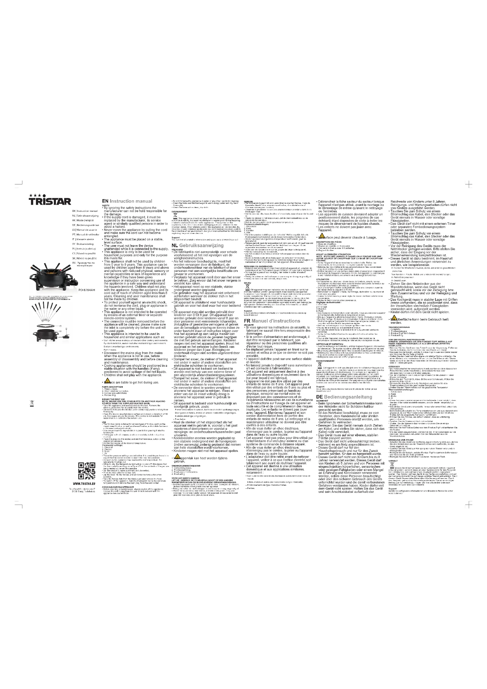 - La surface peut devenir chaude à l'usage. DESCRIPTION DES PIÈCES1. Base de chauffage.2. Bouton de contrôle de thermostat.3. Caquelon à fondue avec 8 fourchettes4. Bague à fondueAVANT LA PREMIÈRE UTILISATIONNOTE: N'UTILISEZ JAMAIS LE CAQUELON À FONDUE SUR UNEAUTRE SOURCE DE CHAUFFAGE QUE LA BASE DE CHAUFFAGEFOURNIE.• Sortez l'appareil et les accessoires hors de la boîte.Retirez lesautocollants, le film protecteur ou le plastique de l'appareil.• Nettoyez les fourchettes et le caquelon à fondue à l'eau savonneusechaude et séchez-les soigneusement.• Mettez l'appareil sur une surface stable plate et assurez un dégagementtout autour de l'appareil d'au moins 10 cm. Cet appareil ne convient pasà une installation dans une armoire ou à un usage à l'extérieur.UTILISATION• Le caquelon est idéal pour divers types de fondues, ainsi la fonduebourguignonne classique mais aussi la fondue savoyarde, la fondue auchocolat ou la fondue chinoise (au bouillon).• Vous pouvez préchauffer les ingrédients dans une casserole avant deles verser dans le caquelon à fondue.• Remplissez le caquelon d'huile, de fromage, de bouillon ou de chocolatmais sans exagérer.• Insérez la fiche dans la prise et réglez le bouton de thermostat à votreconvenance.• Réglez le thermostat à votre convenance.Réglages de thermostat :1. Chocolat2. Fromage3. Bouillon4. Huile• Ces réglages de température sont indicatifs. Vous pouvez avoir à ajusterle thermostat afin d'atteindre la température idéale.• Dès que l'appareil a atteint la température réglée, l'indicateur s'éteint.• Pendant l'usage, l'indicateur de température s'allume et s'éteint. C'estl'indication que le thermostat fonctionne bien et que le contenu ducaquelon est chauffé à la température réglée.• Remuez la fondue pour vous assurer qu'elle a bien fondu.• Piquez les aliments sur la fourchette à fondue.• Plongez les aliments dans la fondue et remuez pendant quelquessecondes.• Sortez la fourchette à fondue du caquelon à fondue et retirez lesaliments.• Pour arrêter l'appareil, tournez la molette du thermostat sur latempérature minimum et retirez la fiche secteur de la prise murale.NETTOYAGE ET ENTRETIEN• Avant le nettoyage ou l'entretien, arrêtez toujours l'appareil, débranchezla fiche secteur de la prise murale et attendez que l'appareil refroidisse.• Ne plongez pas l'appareil dans l'eau ou autres liquides pour le nettoyer.• Nettoyez les fourchettes et le caquelon à fondue à l'eau savonneusechaude et séchez-les soigneusement.• Nettoyez la base avec un chiffon propre et sec.ENVIRONNEMENTCet appareil ne doit pas être jeté avec les déchets ménagers à lafin de sa durée de vie, il doit être remis à un centre de recyclage pour lesappareils électriques et électroniques. Ce symbole sur l'appareil, lemanuel d'utilisation et l'emballage attire votre attention sur un pointimportant. Les matériaux utilisés dans cet appareil sont recyclables. Enrecyclant vos appareils, vous contribuez de manière significative à laprotection de notre environnement. Renseignez-vous auprès des autoritéslocales pour connaître les centres de collecte des déchets.SupportVous retrouvez toutes les informations et pièces de rechange surwww.tristar.eu! DEBedienungsanleitung SICHERHEIT