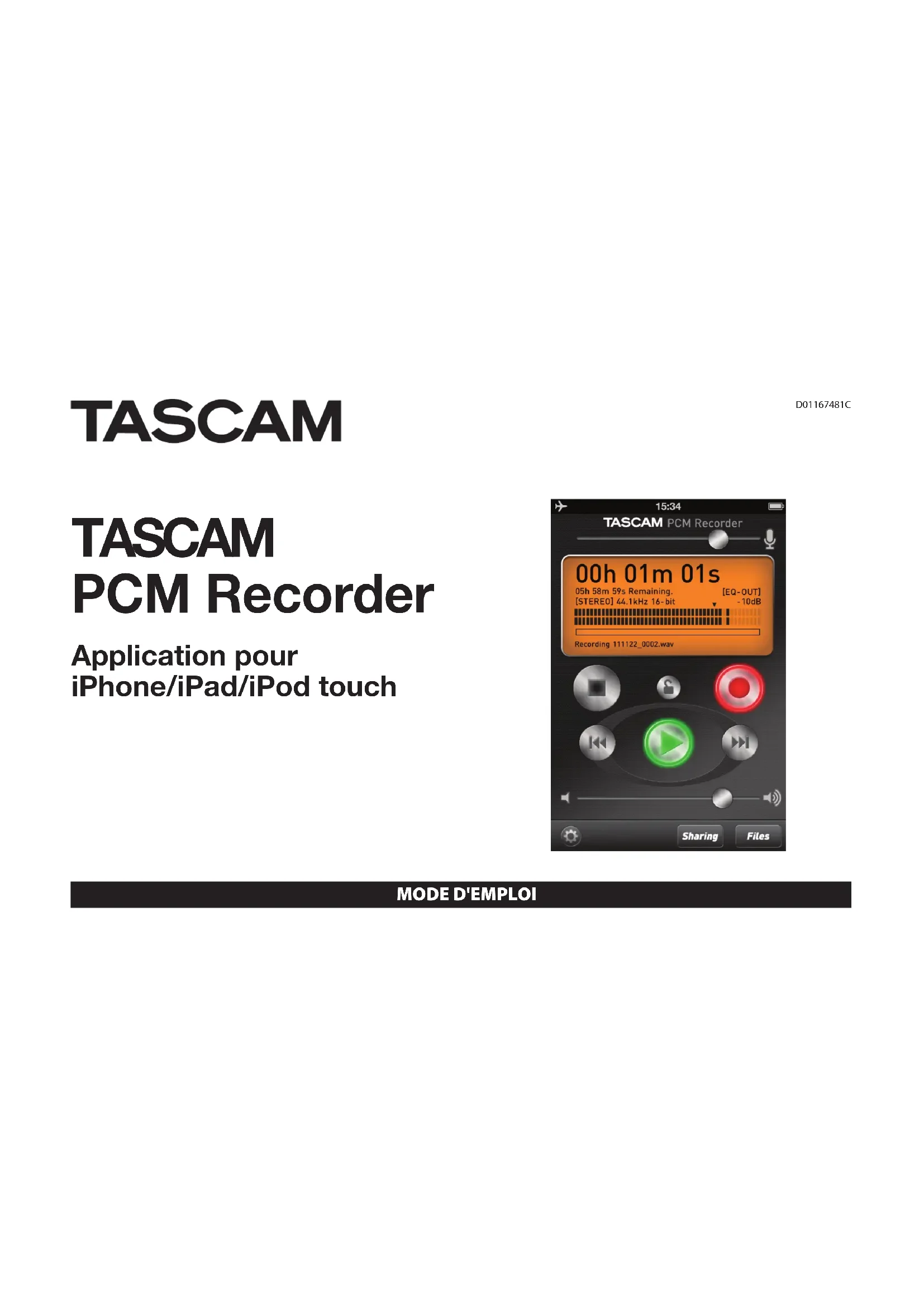 and is used under license.4 TASCAM PCM Recorder Contenu de la fenêtre principale Quand vous lancez TASCAM PCM Recorder, vous voyez apparaître l'écran principal: (ce document présente les écrans dans l'iPhone 4, la version pour iPad diffère légèrement). 1 Niveau d'entrée Montez ou descendez pour changer le niveau d'enregistrement. Une ligne affiche le gain unitaire (pas d'atténuation ni de renforcement du niveau) pour l'emploi avec des interfaces USB telles que l'iM2 TASCAM. 2 Temps Affiche le temps écoulé dans votre fichier durant l'enregistrement ou la lecture. 3 Temps restant En lecture, affiche le temps restant d'ici à la fin du fichier. En enregistrement, affiche le temps restant avant d'atteindre la taille de fichier maximale. Vous pouvez enregistrer durant 12 heures en mono ou 6 heures en stéréo. NOTE Le temps restant affiché varie en fonction de l'espace libre restant sur l'iPhone/iPad/ iPod touch. 4 Format de fichier Indique si l'enregistreur est en mode d'enregistrement stéréo ou mono. Indique également la résolution d'enregistrement de votre fichier WAV. Le format d'enregistrement est toujours 44,1kHz, 16 bits. Vous pouvez charger des fichiers dans l'application avec iTunes sur l'ordinateur connecté via le dock (voir "7 Mono/ Stereo" dans la section "Contenu de la fenêtre Réglages"). 5 Indicateur de niveau Le niveau du son entrant ou lu est affiché graphiquement dans cet indicateur de niveau à barres. Le niveau est aussi affiché numériquement au-dessus de cet indicateur. 6 Nom du fichier Affiche le nom de votre fichier. La structure d'appellation automatique de fichier est AAMMJJ_NNNN.wav (année, mois, jour, numéro). Vous pouvez changer ultérieurement le nom de votre enregistrement dans l'écran Files (fichiers). 7 Stop Arrête la lecture ou l'enregistrement. 8 Verrouillage Verrouille toutes les commandes de cette application sauf le volume de sortie. Vous pouvez vouloir presser le bouton Enregistrement puis celui de verrouillage pour éviter de presser accidentellement le bouton Stop si l'appareil est dans votre poche. 9 Retour rapide Ramène au début du fichier. Pour revenir au fichier précédent dans la liste des fichiers, pressez le bouton Retour rapide dans les 3 secondes qui suivent le lancement de la lecture du fichier depuis son début. Vous pouvez aussi rechercher en arrière de façon incrémentielle dans le fichier en pressant et en maintenant le bouton. F_TASCAM_PCM_Recorder.indd 4 28/12/11 19:25TASCAM PCM Recorder 5 0 Lecture Presser ce bouton fait lire le fichier actuellement chargé. Si vous pressez ce bouton durant la lecture, le fichier recule de 3 secondes et poursuit la lecture depuis ce nouveau point. q Volume de sortie Atténue la sortie. Ce réglage est indépendant du volume du casque de votre iPhone/ iPad/iPod touch. Une ligne affiche le gain unitaire. w Réglages Pressez ce bouton pour ouvrir la fenêtre des réglages (voir la section suivante). e Sharing (partage) Pressez ce bouton pour ouvrir la fenêtre de partage SoundCloud (voir la section "La fenêtre Sharing (partage)"). r Files (fichiers) Pressez ce bouton pour ouvrir la fenêtre Files (fichiers) (voir la section "Contenu de la fenêtre Files (fichiers)"). t Statut de l'égaliseur Indique si la correction de l'égaliseur est enregistrée dans le fichier ("EQ-In") ou si elle n'agit que sur la lecture ("EQ-Out"). Vous pouvez changer les réglages de l'égaliseur dans la fenêtre Réglages. y Barre de progression Durant la lecture ou à l'arrêt, cette barre indique l'avancée dans le fichier que vous avez lu. Si vous appuyez sur cette barre et faites glisser votre doigt, vous pouvez "parcourir" le fichier. u Enregistrement Pressez une fois ce bouton pour armer l'enregistrement de l'unité (le voyant d'enregistrement clignote). Puis pressez le bouton Lecture ou à nouveau le bouton Enregistrement pour lancer l'enregistrement. i Avance rapide Pressez une fois ce bouton pour sauter au fichier suivant dans la liste des fichiers. Vous pouvez aussi effectuer une recherche vers l'avant de façon incrémentielle dans votre enregistrement en pressant et en maintenant le bouton. Contenu de la fenêtre principale F_TASCAM_PCM_Recorder.indd 5 28/12/11 19:256 TASCAM PCM Recorder Contenu de la fenêtre Réglages Pressez le bouton Réglages (la "roue dentée" dans le coin inférieur gauche de la fenêtre) pour ouvrir la fenêtre réglage. Les commandes suivantes sont disponibles dans cette fenêtre: 1 High EQ Cette commande ajoute ou soustrait des hautes fréquences à l'audio (en plateau à partir de 4500Hz). Cette correction peut être ajoutée au son entrant si le bouton "EQ to Input" est activé (rouge) ou au son sortant si le bouton "EQ to Input" est désactivé (gris) (voir "4 EQ to Input" ci-dessous). 2 Low EQ Cette commande ajoute ou soustrait des basses fréquences à l'audio (en plateau à partir de 250Hz). 3 Speaker Active ou désactive le haut-parleur de l'iPhone/iPad/iPod touch. Cette option n'est disponible que si vous utilisez l'audio intégré à votre appareil Apple. Quand une interface USB ou un accessoire connecteur de Dock est branché, ce bouton ne fait rien. Le haut-parleur est automatiquement désactivé quand vous pressez le bouton Enregistrement pour éviter toute réinjection (effet larsen), mais vous pouvez le remettre en service si désiré en mode d'armement pour l'enregistrement. 4 EQ to Input Quand ce bouton est activé (rouge), les corrections tonales effectuées avec l'égaliseur sont inscrites dans le fichier que vous enregistrez. NOTE TASCAM PCM Recorder conserve les réglages High EQ et Low EQ pour l'entrée ou la sortie du son, selon le réglage du bouton "EQ to Input" (activé/désactivé). Les réglages d'égaliseur peuvent s'appliquer à l'entrée du son ou à la sortie de celui-ci. 5 Lo-Cut Quand ce bouton est activé, cela coupe toutes les basses fréquences. 6 L/R Swap Quand vous utilisez une source d'entrée numérique stéréo telle que