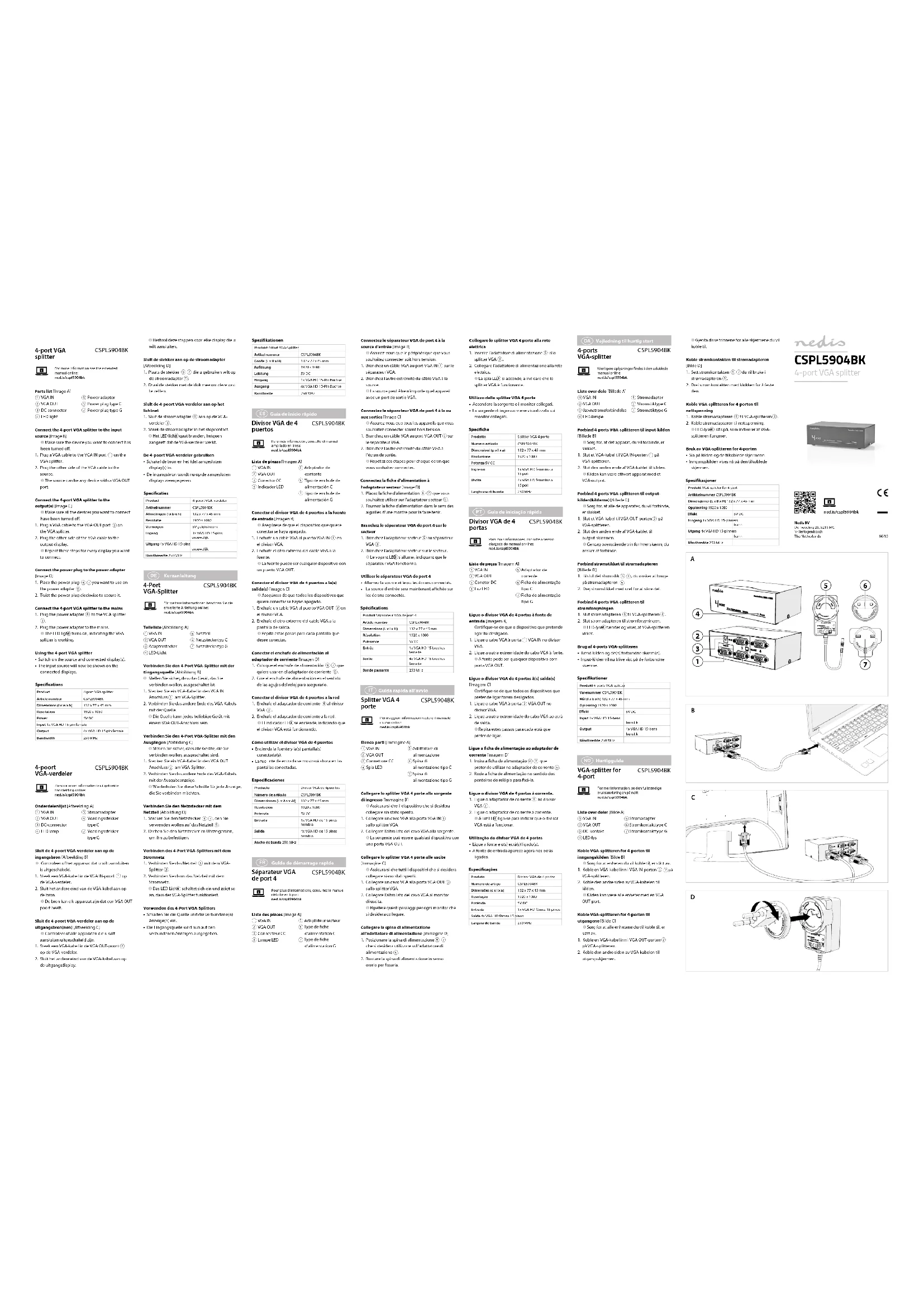 liga-se para indicar que o divisor VGA está a funcionar.Utilização do divisor VGA de 4 portas• Ligue a fonte e o(s) ecrã(s) ligado(s).• A fonte de entrada aparece agora nos ecrãs ligados.Produto Divisor VGA de 4 portasNúmero de artigo CSPL5904BKDimensões (c x l x a) 132 x 77 x 45 mmResolução 1920 x 1080Potência 5V DCEntrada 1x VGA HD fêmea 15 pinosSaída 4x VGA HD fêmea 15 pinosLargura de banda 250 MHzConnectez le séparateur VGA de port 4 à la source d'entrée [Image B] 4 Assurez-vous que le périphérique que vous souhaitez connecter soit hors tension.1. Branchez un câble VGA au port VGA IN sur le séparateur VGA.2. Branchez l'autre extrémité du câble VGA à la source. 4 La source peut être n’importe quel appareil avec un port de sortie VGA.Connectez le séparateur VGA de port 4 à la ou aux sorties [Image C] 4 Assurez-vous que tous les appareils que vous souhaitez connecter soient hors tension.1. Branchez un câble VGA au port VGA OUT sur le séparateur VGA.2. Branchez l'autre extrémité du câble VGA à l’écran de sortie. 4 Répétez ces étapes pour chaque écran que vous souhaitez connecter.l'adaptateur secteur [Image D]