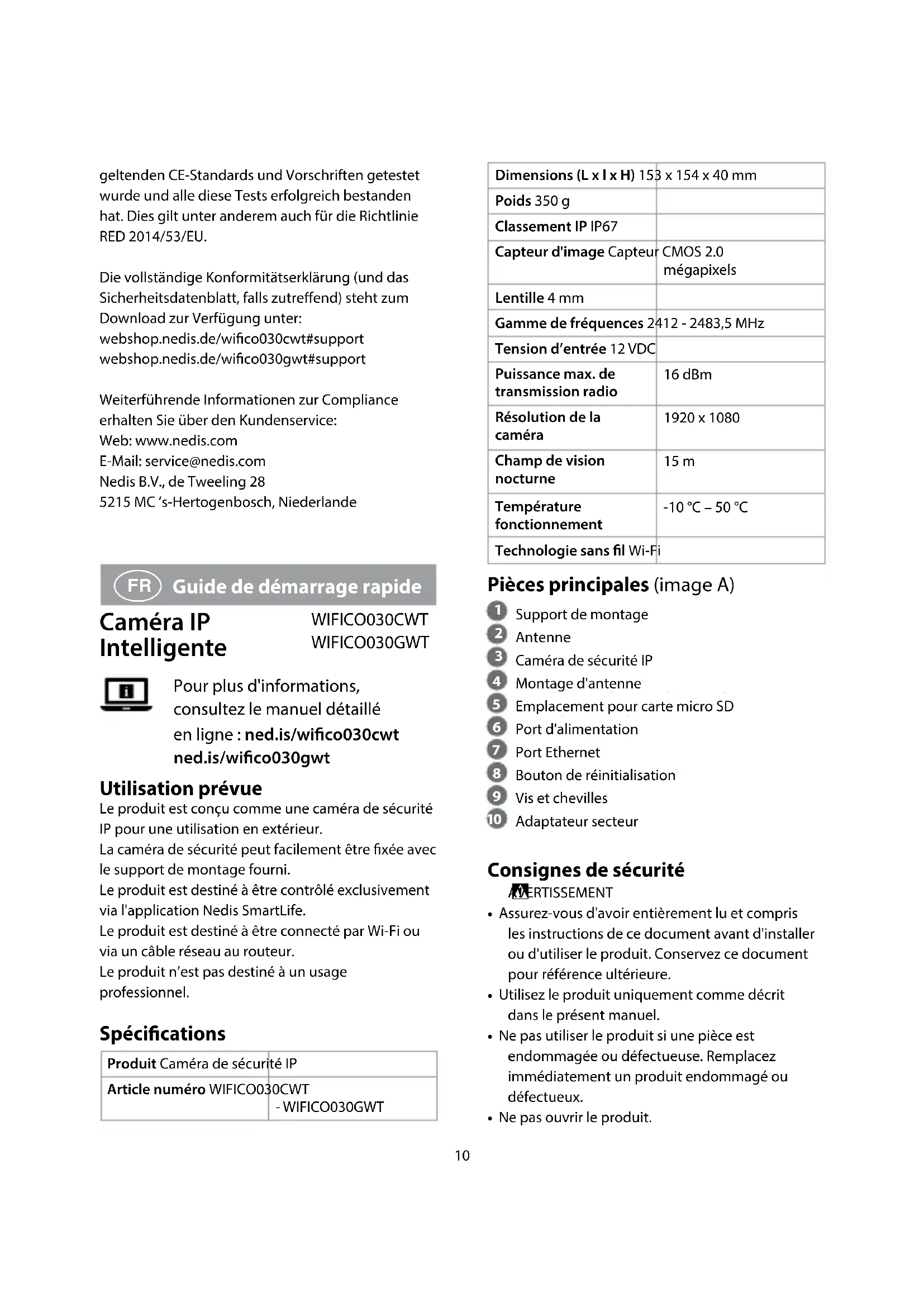 cm devant la caméra.12 Déclaration de conformité Nous, Nedis B.V., déclarons en tant que fabricant que le produit WIFICO030CWT - WIFICO030GWT de notre marque Nedis , produit en Chine, a été testé conformément à toutes les normes et réglementations CE en vigueur et que tous les tests ont été réussis. Cela inclut, sans toutefois s'y limiter, la directive RED 2014/53/UE.La Déclaration de conformité complète (et la che de sécurité le cas échéant) peut être trouvée et téléchargée via:webshop.nedis.fr/wico030cwt#supportwebshop.nedis.fr/wico030gwt#supportPour plus d'informations sur la conformité, contactez le service client:Site Web: www.nedis.comE-mail: service@nedis.comde bureau)Nedis B.V., de Tweeling 285215 MC ’s-Hertogenbosch, Pays-Bas
