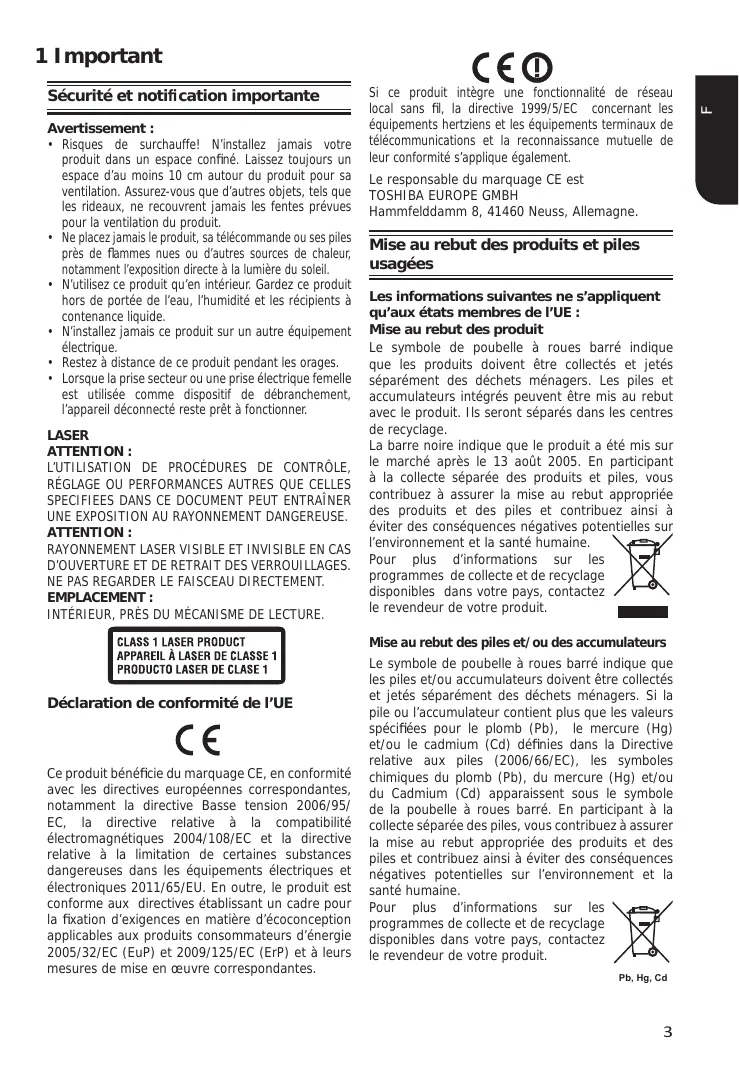 - Lorsque la prise secteur ou une prise électrique femelle est utilisée comme dispositif de débranchement, l’appareil déconnecté reste prêt à fonctionner. LASER ATTENTION : L’UTILISATION DE PROCÉDURES DE CONTRÔLE, RÉGLAGE OU PERFORMANCES AUTRES QUE CELLES SPECIFIEES DANS CE DOCUMENT PEUT ENTRAÎNER UNE EXPOSITION AU RAYONNEMENT DANGEREUSE. ATTENTION : RAYONNEMENT LASER VISIBLE ET INVISIBLE EN CAS D’OUVERTURE ET DE RETRAIT DES VERROUILLAGES. NE PAS REGARDER LE FAISCEAU DIRECTEMENT. EMPLACEMENT : INTÉRIEUR, PRÈS DU MÉCANISME DE LECTURE. Si ce produit intègre une fonctionnalité de réseau local sans fil, la directive 1999/5/EC concernant les équipements hertziens et les équipements terminaux de télécommunications et la reconnaissance mutuelle de leur conformité s’applique également. Le responsable du marquage CE est