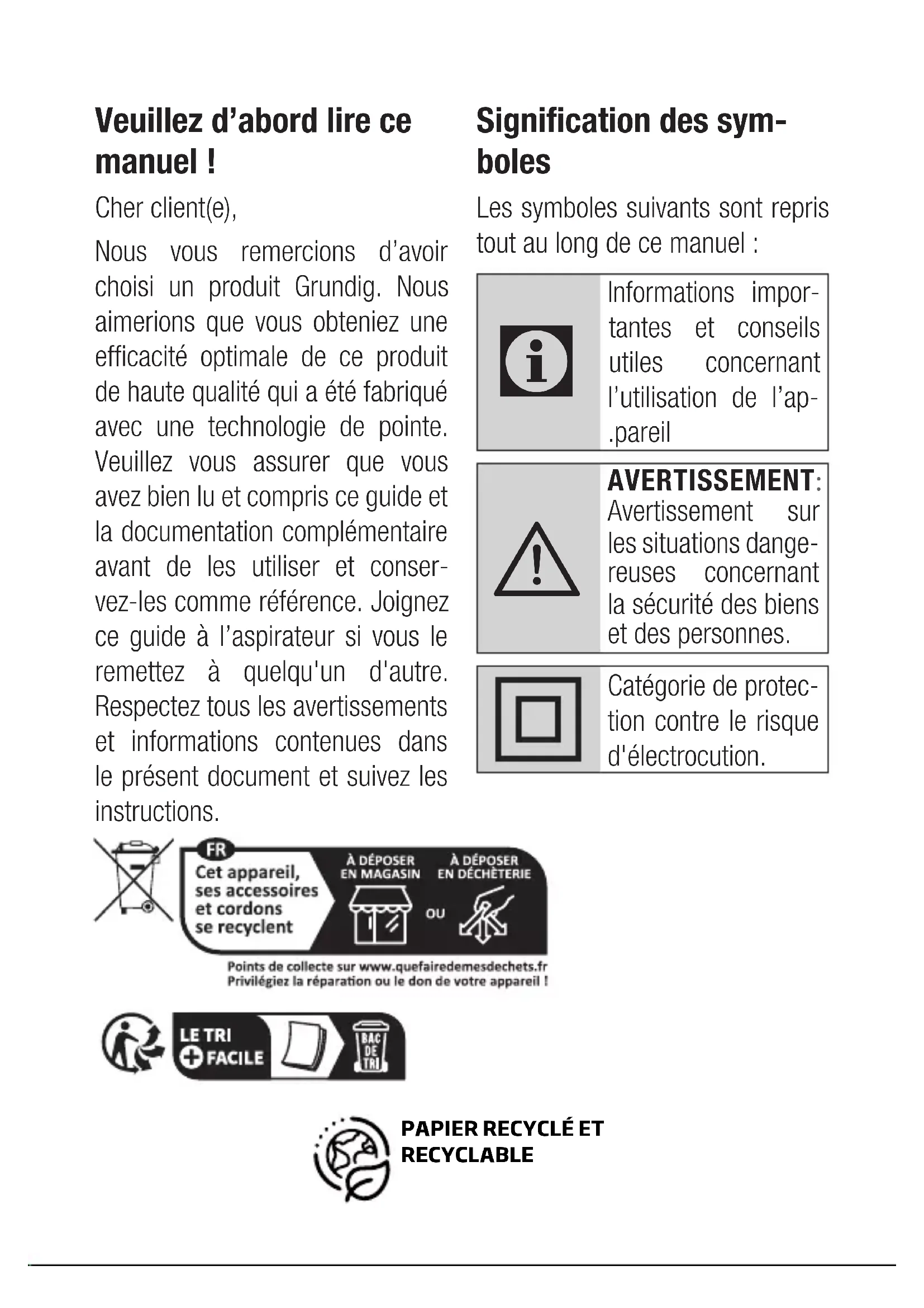 Avertissement sur les situations dange- reuses concernant la sécurité des biens et des personnes. Catégorie de protec- tion contre le risque d'électrocution.