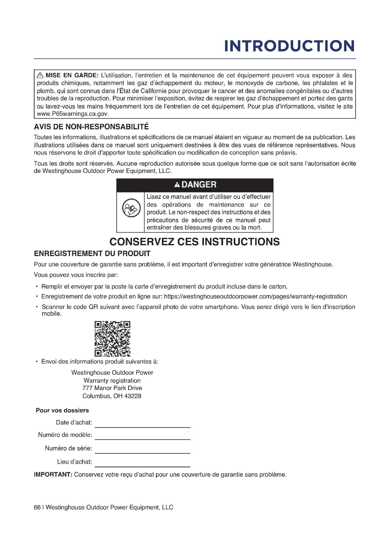 - Enregistrement de votre produit en ligne sur: https://westinghouseoutdoorpower.com/pages/warranty-registration