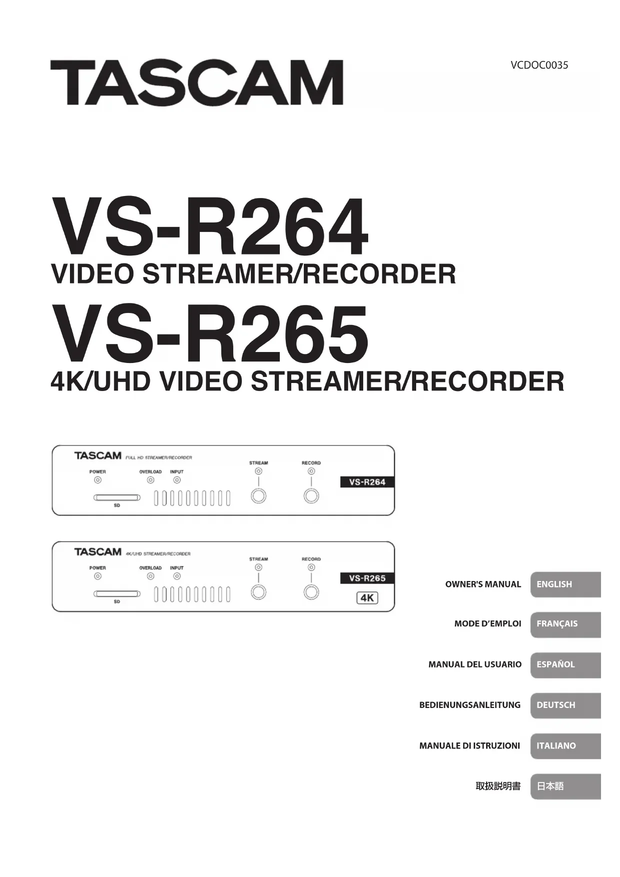 - Autres Introduction Merci beaucoup d'avoir acheté un enregistreur/lecteur de streaming vidéo VS-R264 ou un enregistreur/lecteur de streaming vidéo 4K/UHD VS-R265 TASCAM. Avant de connecter et d’utiliser cette unité, veuillez prendre le temps de lire ce mode d'emploi en totalité pour vous assurer une bonne compréhension de sa mise en service et de son branchement, ainsi que de la façon d'utiliser ses nombreuses fonctions utiles et pratiques. Une fois la lecture de ce mode d'emploi terminée, veillez à le conserver en lieu sûr pour référence ultérieure. Vous pouvez aussi télécharger ce mode d'emploi depuis le site mondial de TEAC (http://teac-global.com/). Note à propos du manuel de référence Ce mode d'emploi explique chacune des fonctions de cette unité. Veuillez consulter le manuel de référence pour des informations détaillées sur chacune des fonctions. Le manuel de référence peut être téléchargé à partir de la clé USB fournie et du site mondial de TEAC (http://teac-global.com/).12 p. 14