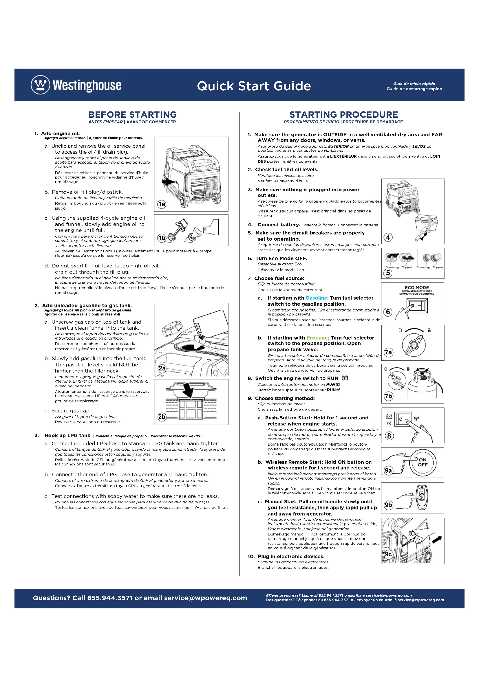 5. Make sure the circuit breakers are properly set to operating. Asegúrese de que los disyuntores estén en la posición correcta. S’assurer que les disjoncteurs sont correctement réglés.6. Turn Eco Mode OFF. Desactive el modo Eco. Désactivez le mode Eco.7. Choose fuel source: Elija la fuente de combustible: Choisissez la source de carburant: a. If starting with Gasoline: Turn fuel selector switch to the gasoline position. Si comienza con gasolina: Gire el selector de combustible a la posición de gasolina. Si vous démarrez avec de l’essence: tournez le sélecteur de carburant sur la position essence. b. If starting with Propane: Turn fuel selector switch to the propane position. Open propane tank valve. Gire el interruptor selector de combustible a la posición de propano. Abra la válvula del tanque de propano. Tournez le sélecteur de carburant sur la position propane. Ouvrir la valve du réservoir de propane.8. Switch the engine switch to RUN . Colocar el interruptor del motor en RUN . Mettez l’interrupteur du moteur sur RUN 9. Choose starting method: Elija el método de inicio: Choisissez la méthode de départ:a. Push-Button Start: Hold for 1 second and release when engine starts. Arranque por botón pulsador: Mantener pulsado el botón de arranque del motor por pulsador durante 1 segundo y, a continuación, soltarlo. Démarrage par bouton-poussoir: Maintenez le bouton-poussoir de démarrage du moteur pendant 1 seconde et relâchez.b. Wireless Remote Start: Hold ON button on wireless remote for 1 second and release. Inicio remoto inalámbrico: mantenga presionado el botón ON en el control remoto inalámbrico durante 1 segundo y suelte. Démarrage à distance sans fil: maintenez le bouton ON de la télécommande sans fil pendant 1 seconde et relâchez.c. Manual Start: Pull recoil handle slowly until you feel resistance, then apply rapid pull up and away from generator. Arranque manual: Tirar de la manija de retroceso lentamente hasta sentir una resistencia y, a continuación, tirar rápidamente y alejarse del generador. Démarrage manuel : Tirez lentement la poignée de démarrage manuel jusqu’à ce que vous sentiez une résistance, puis appliquez une traction rapide vers le haut en vous éloignant de la génératrice.10. Plug in electronic devices. Enchufe los dispositivos electrónicos. Brancher les appareils électroniques.1. Add engine oil. Agregar aceite al motor. | Ajouter de l’huile pour moteurs.a. Unclip and remove the oil service panel to access the oil/fill drain plug. Desenganche y retire el panel de servicio de aceite para acceder al tapón de drenaje de aceite / llenado. Déclipser et retirer le panneau du service d’huile pour accéder au bouchon de vidange d’huile / remplissage.b. Remove oil fill plug/dipstick. Quite el tapón de llenado/varilla de medición. Retirer le bouchon du goulot de remplissage/la jauge.c. Using the supplied 4-cycle engine oil and funnel, slowly add engine oil to the engine until full. Con el aceite para motor de 4 tiempos que se suministra y el embudo, agregue lentamente aceite al motor hasta llenarlo. Au moyen de l’entonnoir (inclus), ajouter lentement l’huile pour moteurs à 4 temps (fournie) jusqu’à ce que le réservoir soit plein.d. Do not overfill, if oil level is too high, oil will drain out through the fill plug. No llene demasiado, si el nivel de aceite es demasiado alto, el aceite se drenará a través del tapón de llenado. Ne pas trop remplir, si le niveau d’huile est trop élevé, l’huile s’écoule par le bouchon de remplissage. 2. Add unleaded gasoline to gas tank. Agregar gasolina sin plomo al depósito de gasolina. Ajouter de l’essence sans plomb au réservoir.a. Unscrew gas cap on top of tank and insert a clean funnel into the tank. Desenrosque el tapón del depósito de gasolina e introduzca el embudo en el orificio. Desserrer le capuchon situé au-dessus du réservoir et y insérer un entonnoir propre.b. Slowly add gasoline into the fuel tank. The gasoline level should NOT be higher than the filler neck. Lentamente, agregue gasolina al depósito de gasolina. El nivel de gasolina NO debe superar el cuello del depósito. Ajouter lentement de l’essence dans le réservoir. Le niveau d’essence NE doit PAS dépasser le goulot de remplissage.c. Secure gas cap. Asegure el tapón de la gasolina. Revisser le capuchon du réservoir.