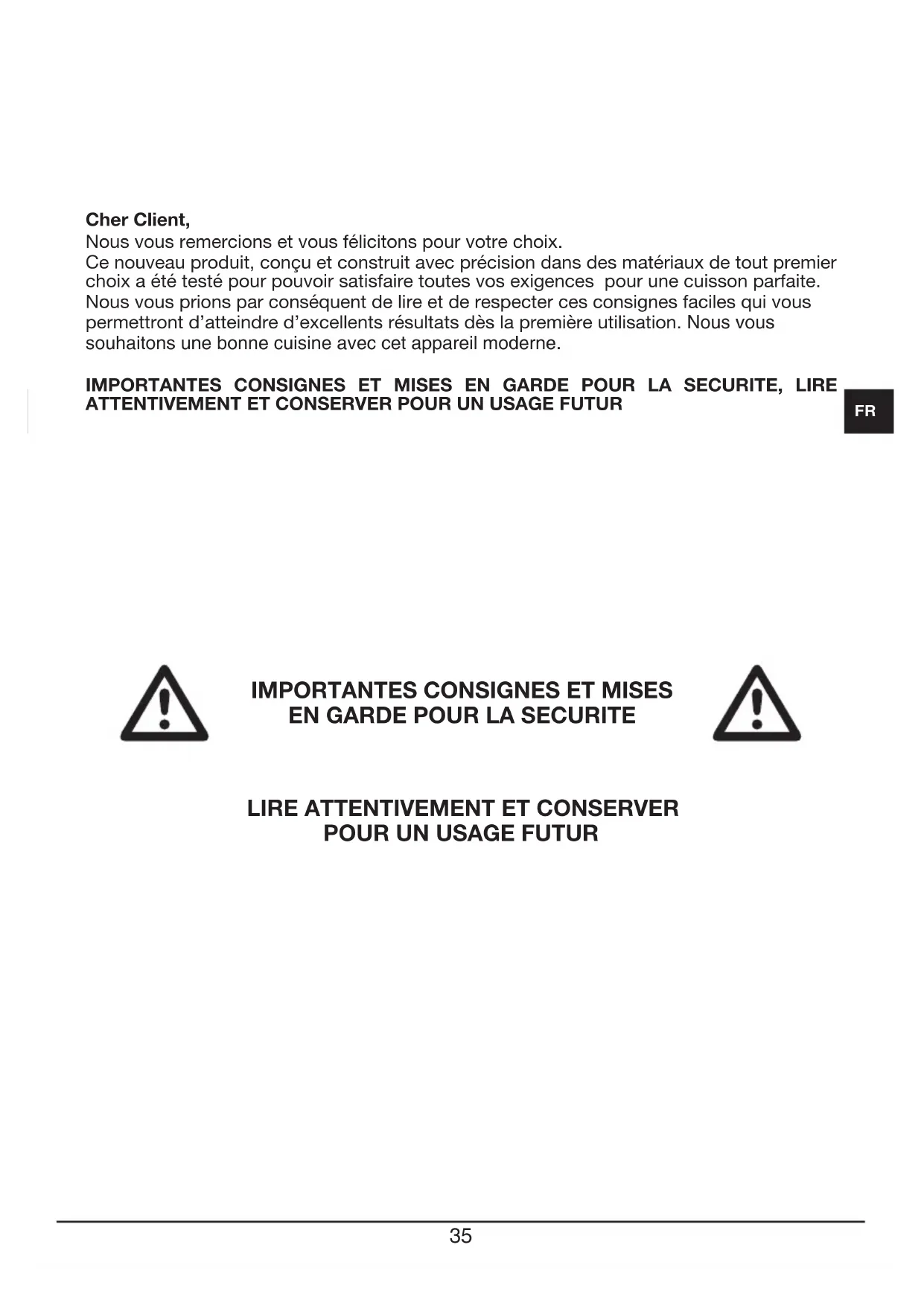 Cher Client, Nous vous remercions et vous félicitons pour votre choix. Ce nouveau produit, conçu et construit avec précision dans des matériaux de tout premier choix a été testé pour pouvoir satisfaire toutes vos exigences pour une cuisson parfaite. Nous vous prions par conséquent de lire et de respecter ces consignes faciles qui vous permettront d’atteindre d’excellents résultats dès la première utilisation. Nous vous souhaitons une bonne cuisine avec cet appareil moderne. IMPORTANTES CONSIGNES ET MISES EN GARDE POUR LA SECURITE, LIRE ATTENTIVEMENT ET CONSERVER POUR UN USAGE FUTUR