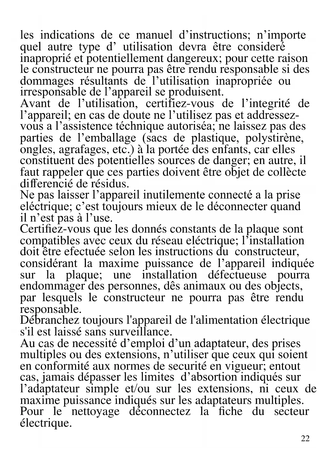 Wh/kg22 les indications de ce manuel d’instructions; n’importe quel autre type d’ utilisation devra être consideré inaproprié et potentiellement dangereux; pour cette raison le constructeur ne pourra pas être rendu responsable si des dommages résultants de l’utilisation inapropriée ou irresponsable de l’appareil se produisent. Avant de l’utilisation, certifiez-vous de l’integrité de l’appareil; en cas de doute ne l’utilisez pas et addressez- vous a l’assistence téchnique autoriséa; ne laissez pas des parties de l’emballage (sacs de plastique, polystirène, ongles, agrafages, etc.) à la portée des enfants, car elles constituent des potentielles sources de danger; en autre, il faut rappeler que ces parties doivent être objet de collècte differencié de résidus. Ne pas laisser l’appareil inutilemente connecté a la prise eléctrique; c’est toujours mieux de le déconnecter quand il n’est pas à l’use. Certifiez-vous que les donnés constants de la plaque sont compatibles avec ceux du réseau eléctrique; l’installation doit être efectuée selon les instructions du constructeur, considérant la maxime puissance de l’appareil indiquée sur la plaque; une installation défectueuse pourra endommager des personnes, dês animaux ou des objects, par lesquels le constructeur ne pourra pas être rendu responsable. Débranchez toujours l'appareil de l'alimentation électrique s'il est laissé sans surveillance. Au cas de necessité d’emploi d’un adaptateur, des prises multiples ou des extensions, n’utiliser que ceux qui soient en conformité aux normes de securité en vigueur; entout cas, jamais dépasser les limites d’absortion indiqués sur l’adaptateur simple et/ou sur les extensions, ni ceux de maxime puissance indiqués sur les adaptateurs multiples. Pour le nettoyage déconnectez la fiche du secteur électrique.23 Quand l’appareil soit hors usage et ait été décidé qu’il ne sera pas reparé, on reccomande son inutilisation, en coupant son câble d’alimentation. - Ne pas approcher le câble d’alimentation d’objects coupants ou de surfaces chaudes, et ne pas tirer sur le cordon d’alimentation pour le débrancher de la prise. Ne le laissez pas pendre du plan de travail où un enfant pourrait le tenir. - Ne pas utiliser l’appareil si le câble d’alimentation ou la fiche de connéction eléctrique sont endommagés, ou encore en cas de court-circuits; dans ce cas là, apporter l’appareil a un centre d’assistence autorisé. - L’appareil n’est pas indiqué pour être exposé à des conditions météorologiques défavorables (pluie, vent, humidité, la glace, etc.); Gardez-le dans un endroit sec. Jamais opérer ou même toucher l’appareil avec les mains mouillées ou les pieds nus. - Cet appareil peut être utilisé par des enfants agés de plus de 8 ans et par des personnes avec une réduite capacité phisique, sensorial ou mental, ou encore avec peu d’expérience à son usage, pourvu qu’une supervision adéquate leur en soit assuré, ou s’ils auraient été instruits à l’usage de l’appareil en complete securité. Les opérations de nettoyage e de manutention ne oivent pás être efectués par des enfants, sauf pour ceux qui sont agés de plus de 8 ans et sont supervisionés. - Gardez l’appareil et le câble d’alimentation hors la portée des enfants agés de moins de 8 ans. Si le câble d'alimentation est endommagé ou en cas de panne et / ou de dysfonctionnement, ne modifiez pas l'appareil. Toute réparation doit être effectuée par le fabricant ou par son service d'assistance technique ou, en tout cas, par une personne possédant une qualification similaire, afin d'éviter tout risque. Le non-respect de ce qui précède peut compromettre la sécurité de l'appareil et24 invalider les conditions de la garantie. ATTENTION: Cet appareil comporte une fonction de chauffage. Quelques surfaces, même si non la plaque elle même, pourront atteindre des températures élevées. Étant donné que la sensibilité à la température diffère de personne à personne, cet appareil devrà être usé avec PRUDENCE. Placez l’appareil sur des surfaces adéhrentes et préparées pour cet effet, et utilisez les mésures de protection contre la chaleur conseillées. - Les enfants ne doivent pas jouer avec cet appareil. - Cet appareil est destiné à être utilisé dans les ménages et des applications similaires: les cuisines du personnel dans les magasins, bureaux et autres environnements de travail, pour les clients dans les hôtels, motels et autres environnements de type résidentiel, de type lit et petit- déjeuner, hébergement. - L’appareil n’est pas conçu pour être utilisé avec une minuterie extérieure ou un commande à distance. - N’utiliser que des accéssoires e pièces d’origine. - ATTENTION: Fonctionnement à induction. Ne pas utiliser sur des tables ou des surfaces en métal. - Avant chaque utilisation, effectuez le cordon d'alimentation. Ne soumettez pas le produit à des chocs susceptibles de l'endommager. - Tenir l’appareil à l’écart des environnements où il peut y avoir des gaz, vapeurs, des substances inflammables ou explosives. ATTENTION, RISQUE D'INCENDIE: Ne pas utiliser pour quelque raison que ce soit sur: - tables ou surfaces métalliques - plaques de cuisson ou poêles - réfrigérateurs et congélateurs dans le cockpit - autres surfaces à âme métallique Le fonctionnement par induction, tout en chauffant la casserole, pourrait également chauffer la surface de25 support métallique, la rendant dans certains cas incandescente. Avant d'utiliser l'appareil, vérifiez également qu'il n'y a pas d'objets métalliques en dessous.