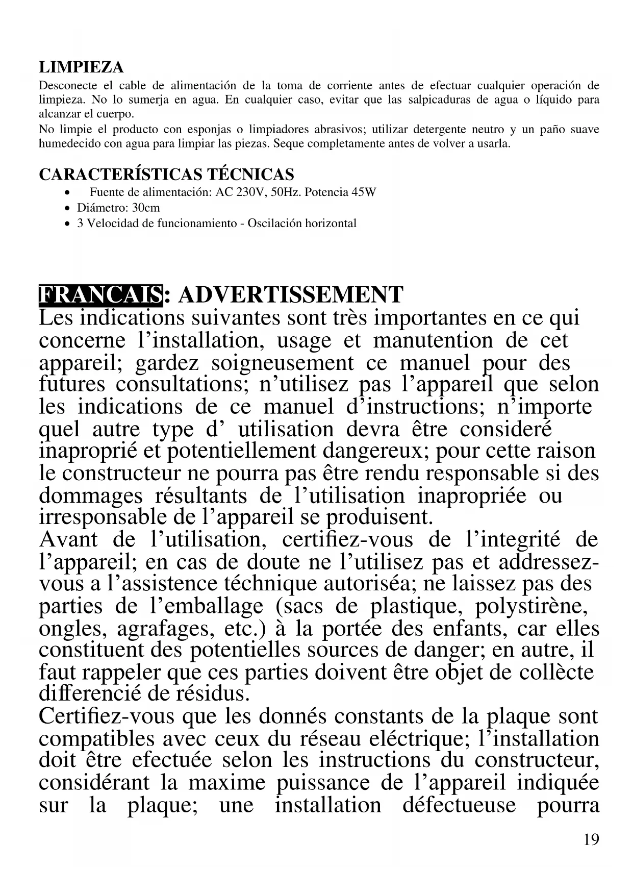 Eféctuez l’installation complète en suivant soigneusement les instructions indiquées sur “Montage". Ne connectez pas au sécteur eléctrique sans que l’installation ne soit complète. Ne laissez pas l’appareil sans supervision quando il est en train d’être utilisé. Déconnectez-le après chaque utilization. Ne pas tirer sur le cordon d’alimentation pour le débrancher de la prise. Ne pas plonger l’appareil dans l’eau ou n’importe quel autre liquide, et éviter que des écabloussures l’atteignent. Avant de commencer n’importe quel opération de nettoyage, déconnectez l’appareil du réseau eléctrique.N’introduisez pas des objets à travers les grilles de protection. Ne barrez pas, d’aucune façon, les barreaux de protection. Placez l’appareil sur des surfaces plâtes, résistantes et stables, éloignées de fenêtres. Le moteur du ventilateur peut fonctionner même si les grilles de protection n’aient pas encore été montées et fixées. Pour une totale securité, realiser l’instalation de manière complete et exaustive.