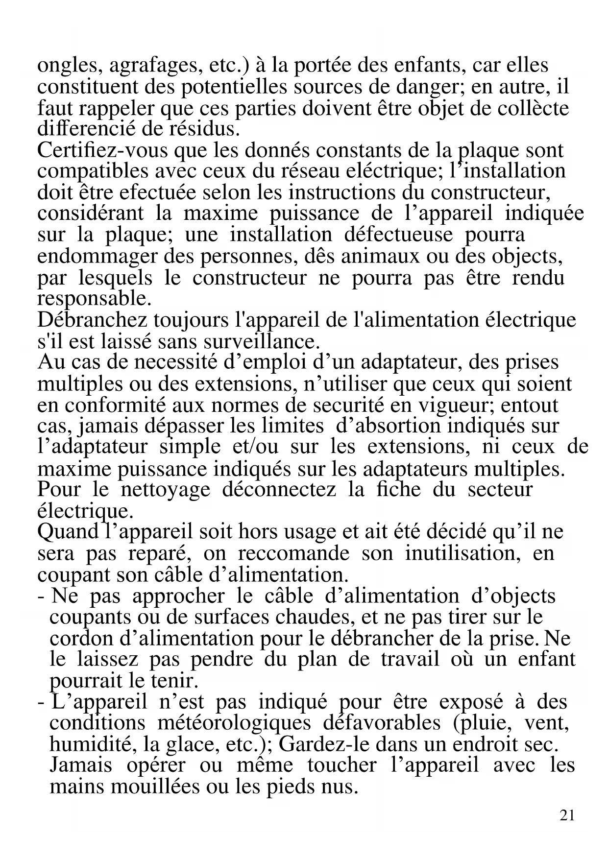 FRANCAIS: AVERTISSEMENT Les indications suivantes sont très importantes en ce qui concerne l’installation, usage et manutention de cet appareil; gardez soigneusement ce manuel pour des futures consultations; n’utilisez pas l’appareil que selon les indications de ce manuel d’instructions; n’importe quel autre type d’ utilisation devra être consideré inaproprié et potentiellement dangereux; pour cette raison le constructeur ne pourra pas être rendu responsable si des dommages résultants de l’utilisation inapropriée ou irresponsable de l’appareil se produisent. Ne pas laisser l’appareil inutilemente connecté a la prise eléctrique; c’est toujours mieux de le déconnecter quand il n’est pas à l’use. Avant de l’utilisation, certifiez-vous de l’integrité de l’appareil; en cas de doute ne l’utilisez pas et addressez- vous a l’assistence téchnique autoriséa; ne laissez pas des parties de l’emballage (sacs de plastique, polystirène,21 ongles, agrafages, etc.) à la portée des enfants, car elles constituent des potentielles sources de danger; en autre, il faut rappeler que ces parties doivent être objet de collècte differencié de résidus. Certifiez-vous que les donnés constants de la plaque sont compatibles avec ceux du réseau eléctrique; l’installation doit être efectuée selon les instructions du constructeur, considérant la maxime puissance de l’appareil indiquée sur la plaque; une installation défectueuse pourra endommager des personnes, dês animaux ou des objects, par lesquels le constructeur ne pourra pas être rendu responsable. Débranchez toujours l'appareil de l'alimentation électrique s'il est laissé sans surveillance. Au cas de necessité d’emploi d’un adaptateur, des prises multiples ou des extensions, n’utiliser que ceux qui soient en conformité aux normes de securité en vigueur; entout cas, jamais dépasser les limites d’absortion indiqués sur l’adaptateur simple et/ou sur les extensions, ni ceux de maxime puissance indiqués sur les adaptateurs multiples. Pour le nettoyage déconnectez la fiche du secteur électrique. Quand l’appareil soit hors usage et ait été décidé qu’il ne sera pas reparé, on reccomande son inutilisation, en coupant son câble d’alimentation. - Ne pas approcher le câble d’alimentation d’objects coupants ou de surfaces chaudes, et ne pas tirer sur le cordon d’alimentation pour le débrancher de la prise. Ne le laissez pas pendre du plan de travail où un enfant pourrait le tenir. - L’appareil n’est pas indiqué pour être exposé à des conditions météorologiques défavorables (pluie, vent, humidité, la glace, etc.); Gardez-le dans un endroit sec. Jamais opérer ou même toucher l’appareil avec les mains mouillées ou les pieds nus.22 - Ne pas utiliser l’appareil si le câble d’alimentation ou la fiche de connéction eléctrique sont endommagés, ou encore en cas de court-circuits; dans ce cas là, apporter l’appareil a un centre d’assistence autorisé. - Cet appareil peut être utilisé par des enfants agés de plus de 8 ans et par des personnes avec une réduite capacité phisique, sensorial ou mental, ou encore avec peu d’expérience à son usage, pourvu qu’une supervision adéquate leur en soit assuré, ou s’ils auraient été instruits à l’usage de l’appareil en complete securité. Les opérations de nettoyage e de manutention ne oivent pás être efectués par des enfants, sauf pour ceux qui sont agés de plus de 8 ans et sont supervisionés. - Gardez l’appareil et le câble d’alimentation hors la portée des enfants agés de moins de 8 ans. Si le câble d'alimentation est endommagé ou en cas de panne et / ou de dysfonctionnement, ne modifiez pas l'appareil. Toute réparation doit être effectuée par le fabricant ou par son service d'assistance technique ou, en tout cas, par une personne possédant une qualification similaire, afin d'éviter tout risque. Le non-respect de ce qui précède peut compromettre la sécurité de l'appareil et invalider les conditions de la garantie. ATTENTION: Cet appareil comporte une fonction de chauffage. Quelques surfaces, même si non la plaque elle même, pourront atteindre des températures élevées. Étant donné que la sensibilité à la température diffère de personne à personne, cet appareil devrà être usé avec PRUDENCE. Placez l’appareil sur des surfaces adéhrentes et préparées pour cet effet, et utilisez les mésures de protection contre la chaleur conseillées. - Les enfants ne doivent pas jouer avec cet appareil. - Cet appareil est destiné à être utilisé dans les ménages et des applications similaires: les cuisines du personnel dans les magasins, bureaux et autres environnements de23 travail, pour les clients dans les hôtels, motels et autres environnements de type résidentiel, de type lit et petit- déjeuner, hébergement. - L’appareil n’est pas conçu pour être utilisé avec une minuterie extérieure ou un commande à distance. - N’utiliser que des accéssoires e pièces d’origine. - Avant chaque utilisation, effectuez le cordon d'alimentation. Ne soumettez pas le produit à des chocs susceptibles de l'endommager. ATTENTION: Fonctionnement à induction. Ne pas utiliser sur des tables ou des surfaces en métal. - Tenir l’appareil à l’écart des environnements où il peut y avoir des gaz, vapeurs, des substances inflammables ou explosives. ATTENTION, RISQUE D'INCENDIE: Ne pas utiliser pour quelque raison que ce soit sur: - tables ou surfaces métalliques - plaques de cuisson ou poêles - réfrigérateurs et congélateurs dans le cockpit - autres surfaces à âme métallique Le fonctionnement par induction, tout en chauffant la casserole, pourrait également chauffer la surface de support métallique, la rendant dans certains cas incandescente. Avant d'utiliser l'appareil, vérifiez également qu'il n'y a pas d'objets métalliques en dessous.