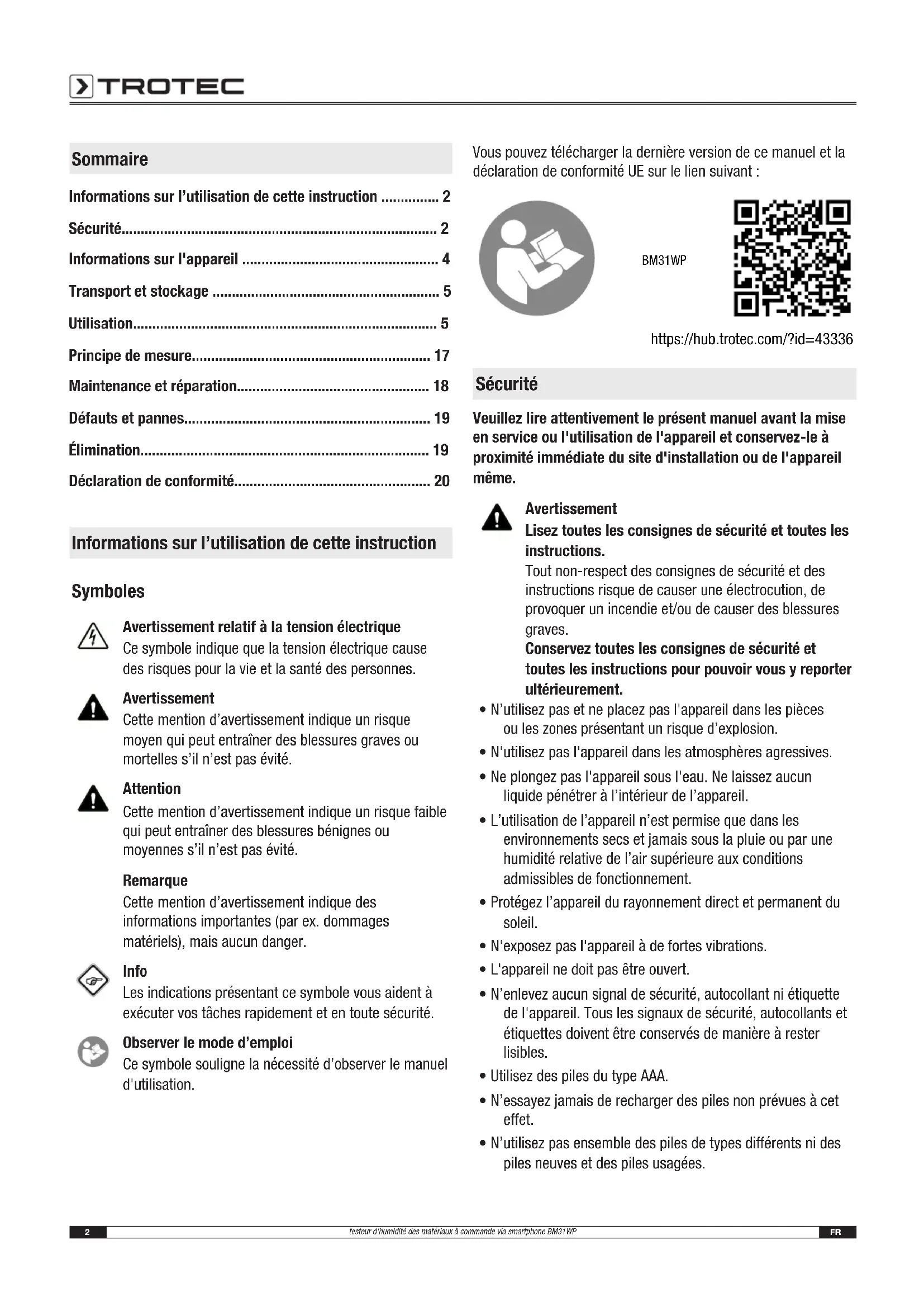 - Déclaration de conformité Informations sur l’utilisation de cette instruction Symboles Avertissement relatif à la tension électrique Ce symbole indique que la tension électrique cause des risques pour la vie et la santé des personnes. Avertissement Cette mention d’avertissement indique un risque moyen qui peut entraîner des blessures graves ou mortelles s’il n’est pas évité. Attention Cette mention d’avertissement indique un risque faible qui peut entraîner des blessures bénignes ou moyennes s’il n’est pas évité. Remarque Cette mention d’avertissement indique des informations importantes (par ex. dommages matériels), mais aucun danger. Info Les indications présentant ce symbole vous aident à exécuter vos tâches rapidement et en toute sécurité. Observer le mode d’emploi Ce symbole souligne la nécessité d’observer le manuel d'utilisation. Vous pouvez télécharger la dernière version de ce manuel et la déclaration de conformitéUE sur le lien suivant: BM31WP https://hub.trotec.com/?id=43336 Sécurité Veuillez lire attentivement le présent manuel avant la mise en service ou l'utilisation de l'appareil et conservez-le à proximité immédiate du site d'installation ou de l'appareil même. Avertissement Lisez toutes les consignes de sécurité et toutes les instructions. Tout non-respect des consignes de sécurité et des instructions risque de causer une électrocution, de provoquer un incendie et/ou de causer des blessures graves. Conservez toutes les consignes de sécurité et toutes les instructions pour pouvoir vous y reporter ultérieurement. p. 20
