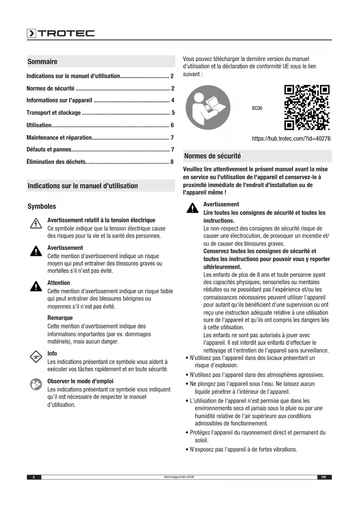 - Élimination des déchets Indications sur le manuel d'utilisation Symboles Avertissement relatif à la tension électrique Ce symbole indique que la tension électrique cause des risques pour la vie et la santé des personnes. Avertissement Cette mention d’avertissement indique un risque moyen qui peut entraîner des blessures graves ou mortelles s’il n’est pas évité. Attention Cette mention d’avertissement indique un risque faible qui peut entraîner des blessures bénignes ou moyennes s’il n’est pas évité. Remarque Cette mention d’avertissement indique des informations importantes (par ex. dommages matériels), mais aucun danger. Info Les indications présentant ce symbole vous aident à exécuter vos tâches rapidement et en toute sécurité. Observer le mode d’emploi Les indications présentant ce symbole vous indiquent qu’il est nécessaire de respecter le manuel d'utilisation. Vous pouvez télécharger la dernière version du manuel d'utilisation et la déclaration de conformité UE sous le lien suivant: BC06 https://hub.trotec.com/?id=40276 Normes de sécurité Veuillez lire attentivement le présent manuel avant la mise en service ou l'utilisation de l'appareil et conservez-le à proximité immédiate de l'endroit d'installation ou de l'appareil même! Avertissement Lire toutes les consignes de sécurité et toutes les instructions. Le non-respect des consignes de sécurité risque de causer une électrocution, de provoquer un incendie et/ ou de causer des blessures graves. Conservez toutes les consignes de sécurité et toutes les instructions pour pouvoir vous y reporter ultérieurement. Les enfants de plus de 8 ans et toute personne ayant des capacités physiques, sensorielles ou mentales réduites ou ne possédant pas l'expérience et/ou les connaissances nécessaires peuvent utiliser l'appareil pour autant qu'ils bénéficient d'une supervision ou ont reçu une instruction adéquate relative à une utilisation sure de l'appareil et qu'ils ont compris les dangers liés à cette utilisation. Les enfants ne sont pas autorisés à jouer avec l'appareil. Il est interdit aux enfants d'effectuer le nettoyage et l'entretien de l’appareil sans surveillance. p. 8