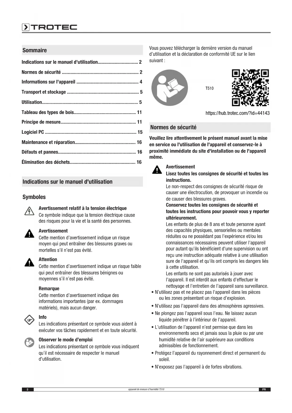 - D'HUMIDITÉ2 FR appareil de mesure d'humidité T510 Sommaire Indications sur le manuel d'utilisation p. 2