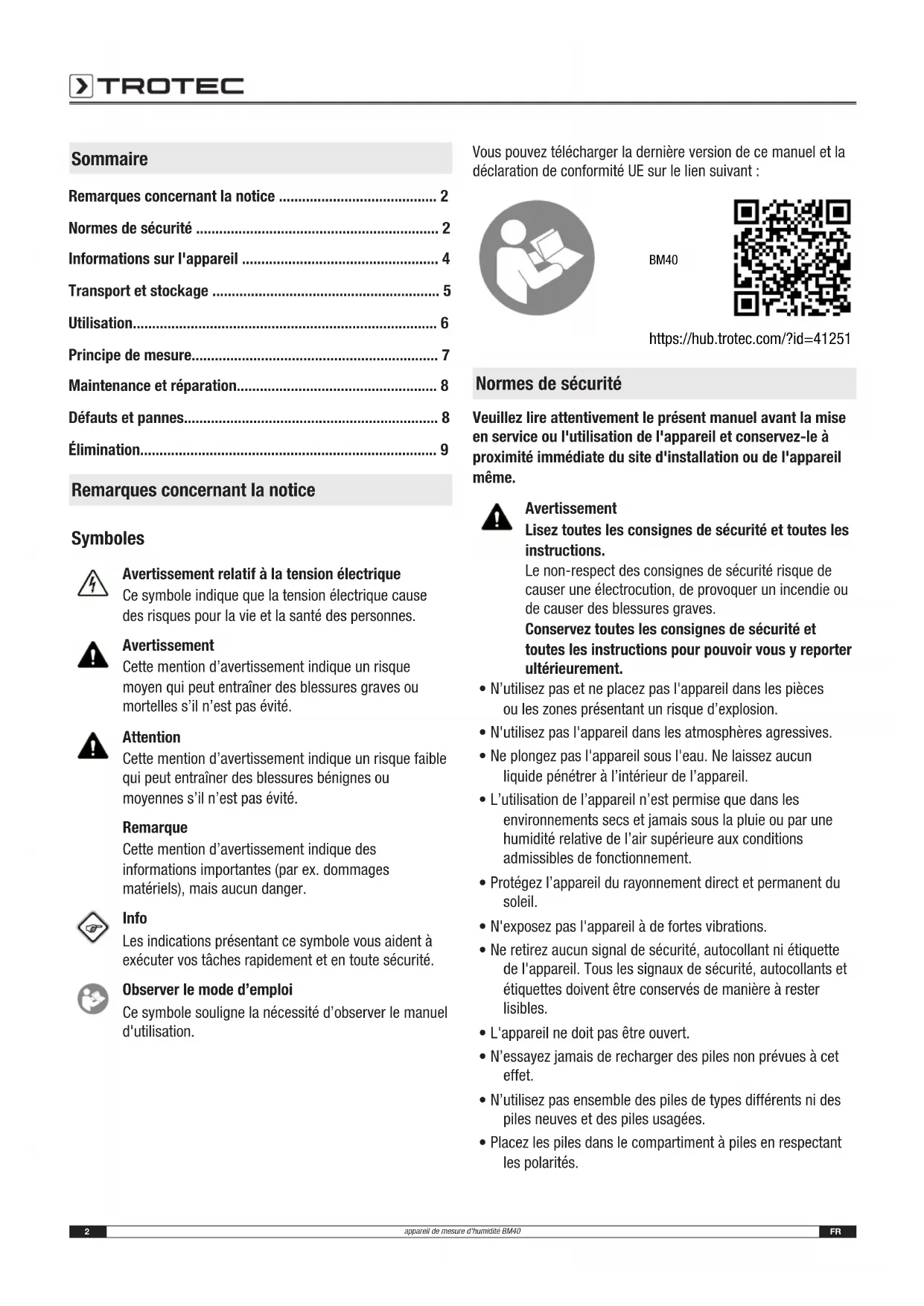 - La tension de la pile est insuffisante. Remplacez la pile sans délai.FR 9 appareil de mesure d'humidité BM40 Élimination Éliminez toujours le matériel d'emballage en respectant les impératifs écologiques et conformément aux prescriptions de gestion des déchets locaux applicables. Le pictogramme représentant une poubelle barrée, apposé sur un appareil électrique ou électronique, provient de la directive européenne 2012/19/UE. Il signifie que cet appareil ne doit pas être éliminé en fin de vie avec les ordures ménagères. Des points de collecte gratuits pour les appareils électriques ou électroniques usagés sont à votre disposition à proximité de chez vous. Les autorités de votre ville ou de votre commune peuvent vous en fournir les adresses. Pour de nombreux pays de l'UE, vous trouverez sur la page Internet https://hub.trotec.com/?id=45090 des informations sur d'autres possibilités de prise en charge. Sinon, adressez-vous à une entreprise homologuée dans votre pays pour le recyclage et l'élimination des appareils électriques usagés. La collecte séparée des appareils électriques et électroniques usagés permet leur réutilisation éventuelle, le recyclage des matériaux constitutifs et les autres formes de recyclage tout en évitant les conséquences négatives pour l’environnement et la santé des produits dangereux qu’ils sont susceptibles de contenir. Les piles usagées et les batteries ne doivent pas être jetées avec les ordures ménagères, mais être éliminées conformément à la directive européenne 2006/66/CE DU PARLEMENT ET DU CONSEIL EUROPEEN du6septembre2006 relative aux piles, aux piles rechargeables, aux accumulateurs et aux batteries. Veuillez éliminer les piles et les batteries conformément aux dispositions légales en vigueur. Valable uniquement en FranceTrotec GmbH Grebbener Str. 7 D-52525 Heinsberg