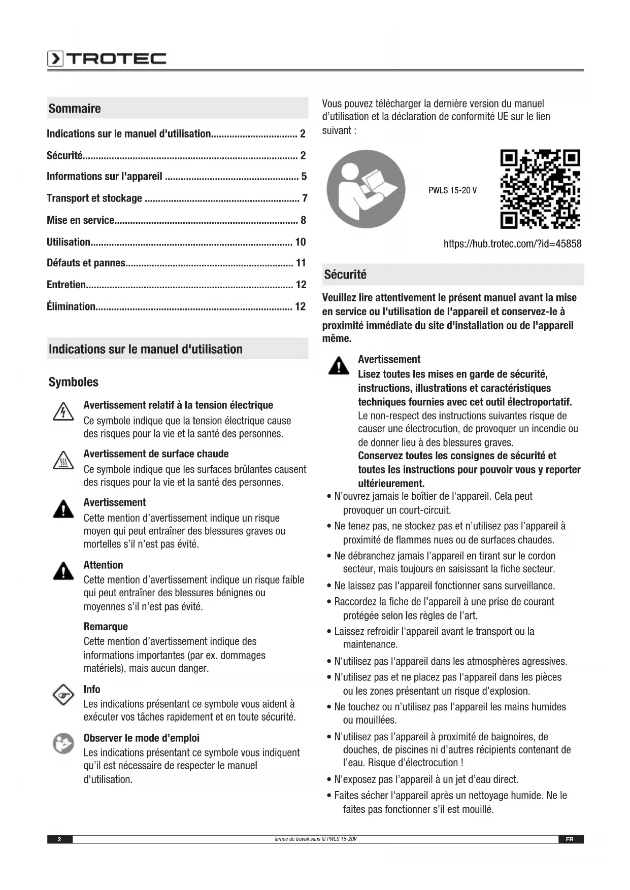 https://hub.trotec.com/?id=45858 Sécurité Veuillez lire attentivement le présent manuel avant la mise en service ou l'utilisation de l'appareil et conservez-le à proximité immédiate du site d'installation ou de l'appareil même. Avertissement Lisez toutes les mises en garde de sécurité, instructions, illustrations et caractéristiques techniques fournies avec cet outil électroportatif. Le non-respect des instructions suivantes risque de causer une électrocution, de provoquer un incendie ou de donner lieu à des blessures graves. Conservez toutes les consignes de sécurité et toutes les instructions pour pouvoir vous y reporter ultérieurement.