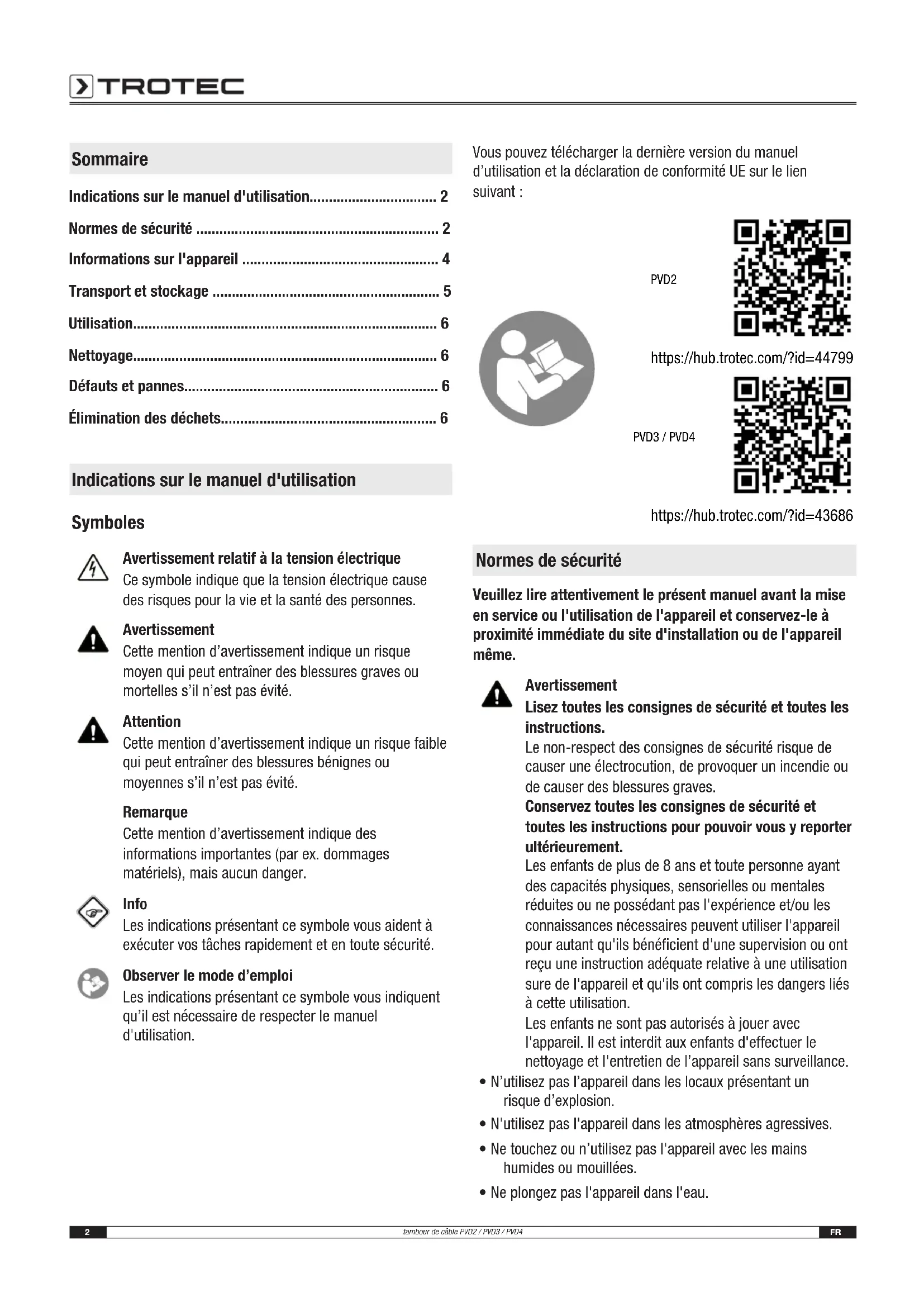 - Élimination des déchets Indications sur le manuel d'utilisation Symboles Avertissement relatif à la tension électrique Ce symbole indique que la tension électrique cause des risques pour la vie et la santé des personnes. Avertissement Cette mention d’avertissement indique un risque moyen qui peut entraîner des blessures graves ou mortelles s’il n’est pas évité. Attention Cette mention d’avertissement indique un risque faible qui peut entraîner des blessures bénignes ou moyennes s’il n’est pas évité. Remarque Cette mention d’avertissement indique des informations importantes (par ex. dommages matériels), mais aucun danger. Info Les indications présentant ce symbole vous aident à exécuter vos tâches rapidement et en toute sécurité. Observer le mode d’emploi Les indications présentant ce symbole vous indiquent qu’il est nécessaire de respecter le manuel d'utilisation. Vous pouvez télécharger la dernière version du manuel d’utilisation et la déclaration de conformité UE sur le lien suivant: PVD2 https://hub.trotec.com/?id=44799 PVD3 / PVD4 https://hub.trotec.com/?id=43686 Normes de sécurité Veuillez lire attentivement le présent manuel avant la mise en service ou l'utilisation de l'appareil et conservez-le à proximité immédiate du site d'installation ou de l'appareil même. Avertissement Lisez toutes les consignes de sécurité et toutes les instructions. Le non-respect des consignes de sécurité risque de causer une électrocution, de provoquer un incendie ou de causer des blessures graves. Conservez toutes les consignes de sécurité et toutes les instructions pour pouvoir vous y reporter ultérieurement. Les enfants de plus de 8ans et toute personne ayant des capacités physiques, sensorielles ou mentales réduites ou ne possédant pas l'expérience et/ou les connaissances nécessaires peuvent utiliser l'appareil pour autant qu'ils bénéficient d'une supervision ou ont reçu une instruction adéquate relative à une utilisation sure de l'appareil et qu'ils ont compris les dangers liés à cette utilisation. Les enfants ne sont pas autorisés à jouer avec l'appareil. Il est interdit aux enfants d'effectuer le nettoyage et l'entretien de l’appareil sans surveillance. p. 6