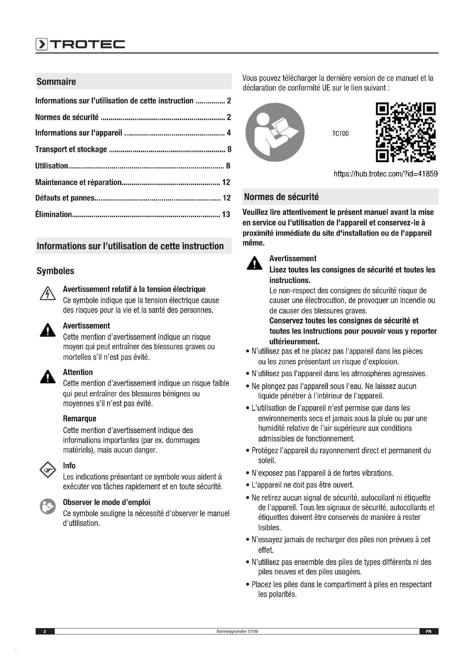 2secondes. ð L'appareil est arrêté. Maintenance et réparation Remplacement des piles Les piles doivent être remplacées lorsque le message «bAt» s’affiche à l’écran(1) de l’appareil ou lorsque celui-ci ne se met plus en marche. Voir chapitre Utilisation Nettoyage Nettoyez l’appareil avec un chiffon humide, doux et non pelucheux. Veillez à ce qu’aucune humidité ne pénètre dans le boîtier. N’utilisez pas d’aérosol, de solvant, de nettoyant à base d’alcool ni de produit abrasif pour nettoyer l’appareil, mais uniquement un chiffon imbibé d’eau claire. Dépannage Veuillez ne pas modifier l'appareil, ni monter des pièces de rechange. Veuillez vous adresser au fabricant pour faire dépanner ou contrôler l'appareil. Défauts et pannes Dans le cadre de sa production, le bon fonctionnement de l'appareil a été contrôlé à plusieurs reprises. Malgré tout, si l'appareil devait présenter des dysfonctionnements, contrôlez-le en vous conformant à la liste suivante: Les messages de défaut suivants peuvent apparaître dans l’affichage des valeurs de mesure de l’humidité relative(16): N° de défaut Cause Remède Er1 Capteur défectueux. Contactez le service après-vente. Er2 Valeur en-dehors de la plage de mesureFR 13 thermohygromètre TC100 Élimination Éliminez toujours le matériel d'emballage en respectant les impératifs écologiques et conformément aux prescriptions de gestion des déchets locaux applicables. Le pictogramme représentant une poubelle barrée, apposé sur un appareil électrique ou électronique, provient de la directive européenne 2012/19/UE. Il signifie que cet appareil ne doit pas être éliminé en fin de vie avec les ordures ménagères. Des points de collecte gratuits pour les appareils électriques ou électroniques usagés sont à votre disposition à proximité de chez vous. Les autorités de votre ville ou de votre commune peuvent vous en fournir les adresses. Pour de nombreux pays de l'UE, vous trouverez sur la page Internet https://hub.trotec.com/?id=45090 des informations sur d'autres possibilités de prise en charge. Sinon, adressez-vous à une entreprise homologuée dans votre pays pour le recyclage et l'élimination des appareils électriques usagés. La collecte séparée des appareils électriques et électroniques usagés permet leur réutilisation éventuelle, le recyclage des matériaux constitutifs et les autres formes de recyclage tout en évitant les conséquences négatives pour l’environnement et la santé des produits dangereux qu’ils sont susceptibles de contenir. Les piles usagées et les batteries ne doivent pas être jetées avec les ordures ménagères, mais être éliminées conformément à la directive européenne 2006/66/CE DU PARLEMENT ET DU CONSEIL EUROPEEN du6septembre2006 relative aux piles, aux piles rechargeables, aux accumulateurs et aux batteries. Veuillez éliminer les piles et les batteries conformément aux dispositions légales en vigueur. Valable uniquement en FranceTrotec GmbH Grebbener Str. 7 D-52525 Heinsberg