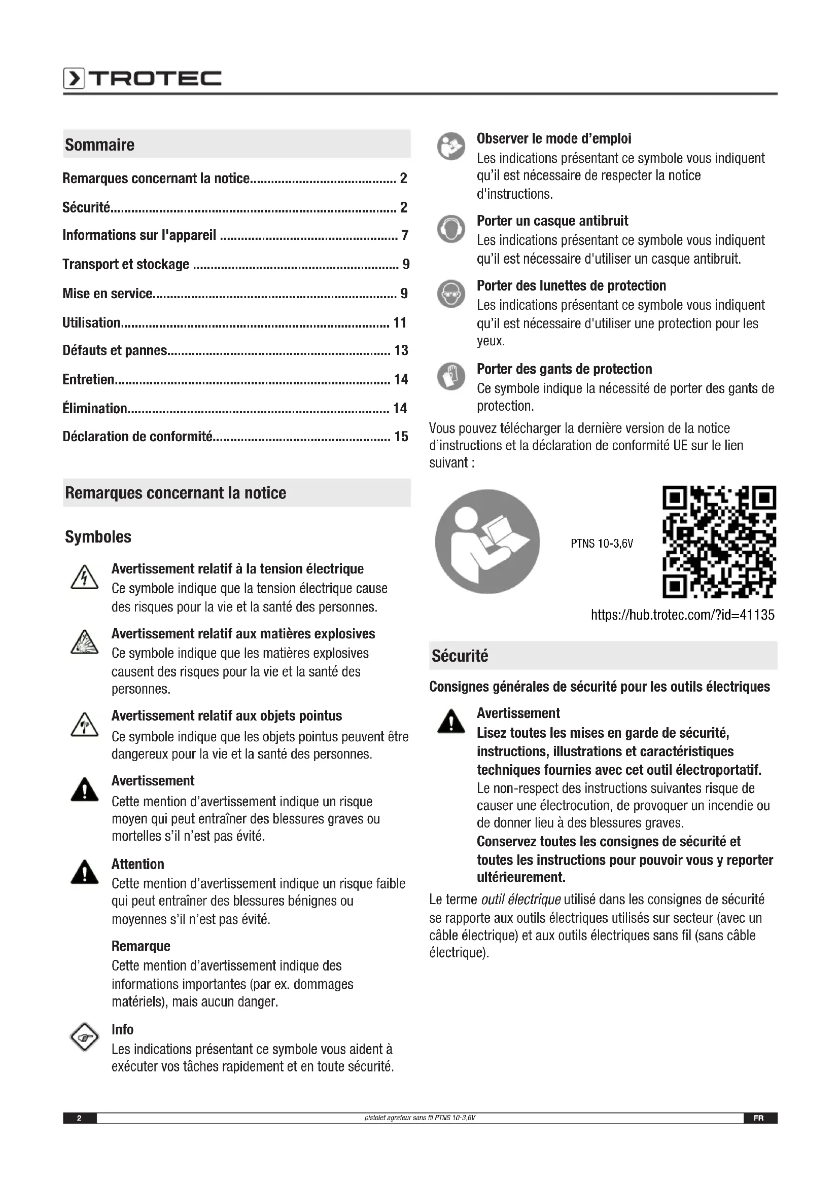 https://hub.trotec.com/?id=41135 Sécurité Consignes générales de sécurité pour les outils électriques Avertissement Lisez toutes les mises en garde de sécurité, instructions, illustrations et caractéristiques techniques fournies avec cet outil électroportatif. Le non-respect des instructions suivantes risque de causer une électrocution, de provoquer un incendie ou de donner lieu à des blessures graves. Conservez toutes les consignes de sécurité et toutes les instructions pour pouvoir vous y reporter ultérieurement. Le terme outil électrique utilisé dans les consignes de sécurité se rapporte aux outils électriques utilisés sur secteur (avec un câble électrique) et aux outils électriques sans fil (sans câble électrique).FR 3 pistolet agrafeur sans fil PTNS 10-3,6V Avertissements de sécurité généraux pour les outils – Sécurité de la zone de travail