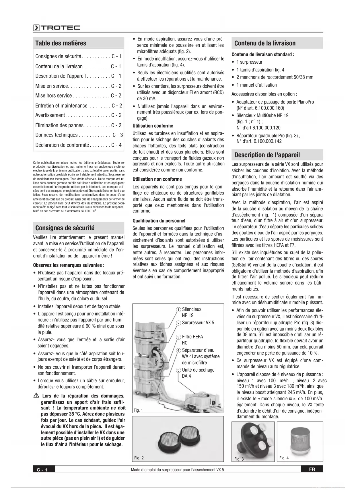 4 Séparateur d’eau WA 4i avec système de microfiltre 5 Unité de séchage DA 4 Fig.2 Table des matières Consignes de sécurité ........... C - 1 Contenu de la livraison ..........C - 1 Description de l'appareil .........C - 1 Mise en service ................C - 2 Mise hors service ..............C - 2 Entretien et maintenance ........C - 2 Avertissement .................C - 2 Élimination des pannes ..........C - 3 Données techniques ............ C - 3 Déclaration de conformité ........C - 4 Cette publication remplace toutes les éditions précédentes. Toute re-production ou divulgation et tout traitement par un quelconque système électronique de la présente publication, dans sa totalité ou en partie, sans notre autorisation préalable écrite sont strictement interdits. Sous réserve de modifications techniques. Tous droits réservés. Toute marque est uti-lisée sans aucune garantie qu'elle soit libre d'utilisation et en appliquant essentiellement l'orthographe utilisée par le fabricant. Les marques utili-sées sont des marques enregistrées devant être considérées en tant que telles. Sous réserve de modifications constructives dans le souci d'une amélioration continue du produit, ainsi que de changements de forme/ de couleur. Le produit livré peut différer des illustrations. Le présent docu-ment a été rédigé avec tout le soin requis. Nous déclinons toute responsa-bilité en cas d’erreurs ou d’omissions. © TROTEC