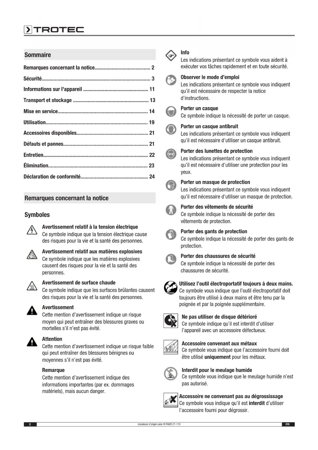 - Déclaration de conformité Remarques concernant la notice Symboles Avertissement relatif à la tension électrique Ce symbole indique que la tension électrique cause des risques pour la vie et la santé des personnes. Avertissement relatif aux matières explosives Ce symbole indique que les matières explosives causent des risques pour la vie et la santé des personnes. Avertissement de surface chaude Ce symbole indique que les surfaces brûlantes causent des risques pour la vie et la santé des personnes. Avertissement Cette mention d’avertissement indique un risque moyen qui peut entraîner des blessures graves ou mortelles s’il n’est pas évité. Attention Cette mention d’avertissement indique un risque faible qui peut entraîner des blessures bénignes ou moyennes s’il n’est pas évité. Remarque Cette mention d’avertissement indique des informations importantes (par ex. dommages matériels), mais aucun danger. Info Les indications présentant ce symbole vous aident à exécuter vos tâches rapidement et en toute sécurité. Observer le mode d’emploi Les indications présentant ce symbole vous indiquent qu’il est nécessaire de respecter la notice d'instructions. Porter un casque Ce symbole indique la nécessité de porter un casque. Porter un casque antibruit Les indications présentant ce symbole vous indiquent qu’il est nécessaire d'utiliser un casque antibruit. Porter des lunettes de protection Les indications présentant ce symbole vous indiquent qu’il est nécessaire d'utiliser une protection pour les yeux. Porter un masque de protection Les indications présentant ce symbole vous indiquent qu’il est nécessaire d'utiliser un masque de protection. Porter des vêtements de sécurité Ce symbole indique la nécessité de porter des vêtements de protection. Porter des gants de protection Ce symbole indique la nécessité de porter des gants de protection. Porter des chaussures de sécurité Ce symbole indique la nécessité de porter des chaussures de sécurité. Utilisez l’outil électroportatif toujours à deux mains. Ce symbole vous indique que l’outil électroportatif doit toujours être utilisé à deux mains et être tenu par la poignée et par la poignée supplémentaire. Ne pas utiliser de disque détérioré Ce symbole indique qu’il est interdit d’utiliser l’appareil avec un accessoire défectueux. Accessoire convenant aux métaux Ce symbole vous indique que l’accessoire fourni doit être utilisé uniquement pour les métaux. Interdit pour le meulage humide Ce symbole vous indique que le meulage humide n’est pas autorisé. Accessoire ne convenant pas au dégrossissage Ce symbole vous indique qu’il est interdit d’utiliser l’accessoire fourni pour dégrossir.FR 3 meuleuse d’angle sans fil PAGS 21-115 Accessoire convenant au tronçonnage Ce symbole vous indique qu’il est autorisé d’utiliser l’accessoire fourni pour tronçonner. Vous pouvez télécharger la dernière version de la notice d’instructions en suivant le lien ci-dessous: PAGS 21-115 https://hub.trotec.com/?id=41427 Sécurité Consignes générales de sécurité pour les outils électriques Avertissement Lisez toutes les mises en garde de sécurité, instructions, illustrations et caractéristiques techniques fournies avec cet outil électroportatif. Le non-respect des instructions suivantes risque de causer une électrocution, de provoquer un incendie ou de donner lieu à des blessures graves. Conservez toutes les consignes de sécurité et toutes les instructions pour pouvoir vous y reporter ultérieurement. Le terme outil électrique utilisé dans les consignes de sécurité se rapporte aux outils électriques utilisés sur secteur (avec un câble électrique) et aux outils électriques sans fil (sans câble électrique). Avertissements de sécurité généraux pour les outils – Sécurité de la zone de travail p. 24