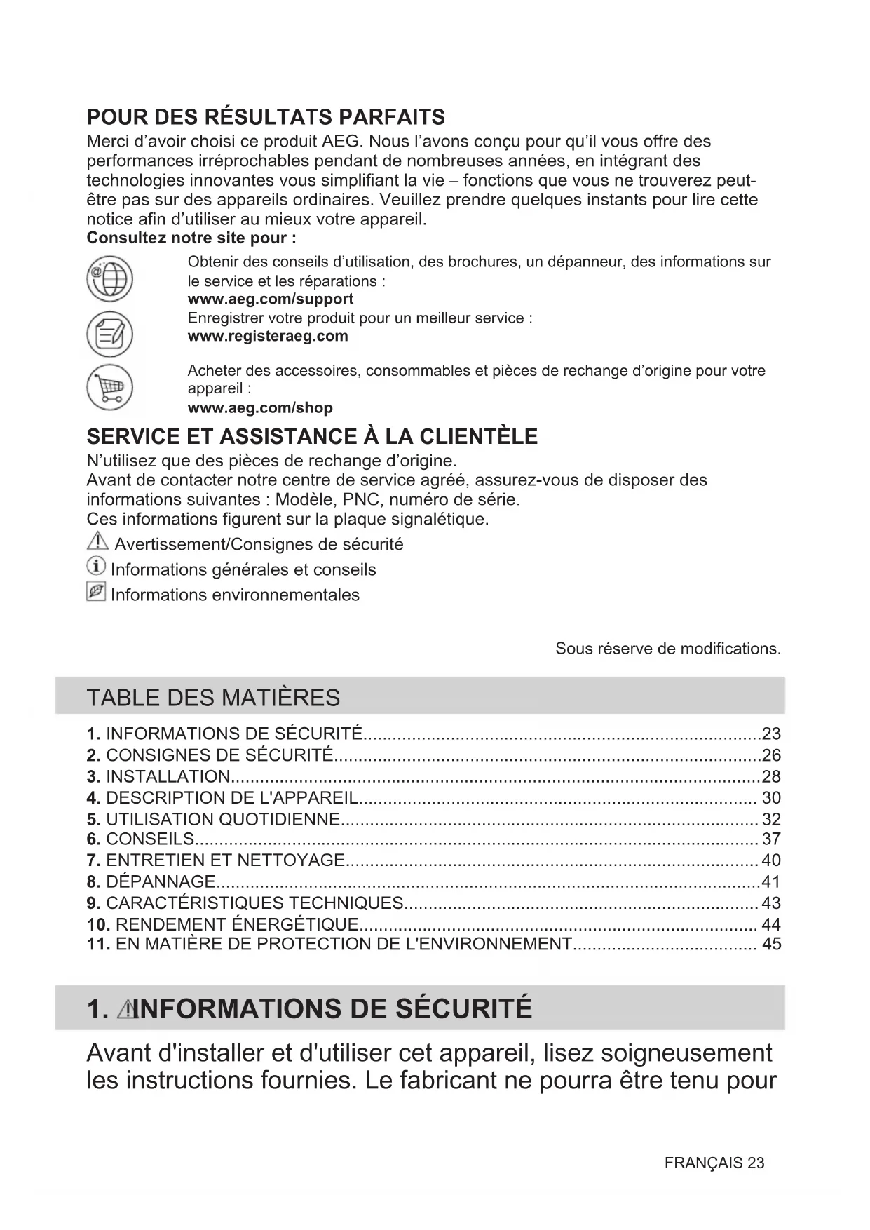 Merci d’avoir choisi ce produit AEG. Nous l’avons conçu pour qu’il vous offre des performances irréprochables pendant de nombreuses années, en intégrant des technologies innovantes vous simplifiant la vie – fonctions que vous ne trouverez peut- être pas sur des appareils ordinaires. Veuillez prendre quelques instants pour lire cette notice afin d’utiliser au mieux votre appareil. Consultez notre site pour :Obtenir des conseils d’utilisation, des brochures, un dépanneur, des informations surle service et les réparations :www.aeg.com/supportEnregistrer votre produit pour un meilleur service :www.registeraeg.comAcheter des accessoires, consommables et pièces de rechange d’origine pour votreappareil :www.aeg.com/shop