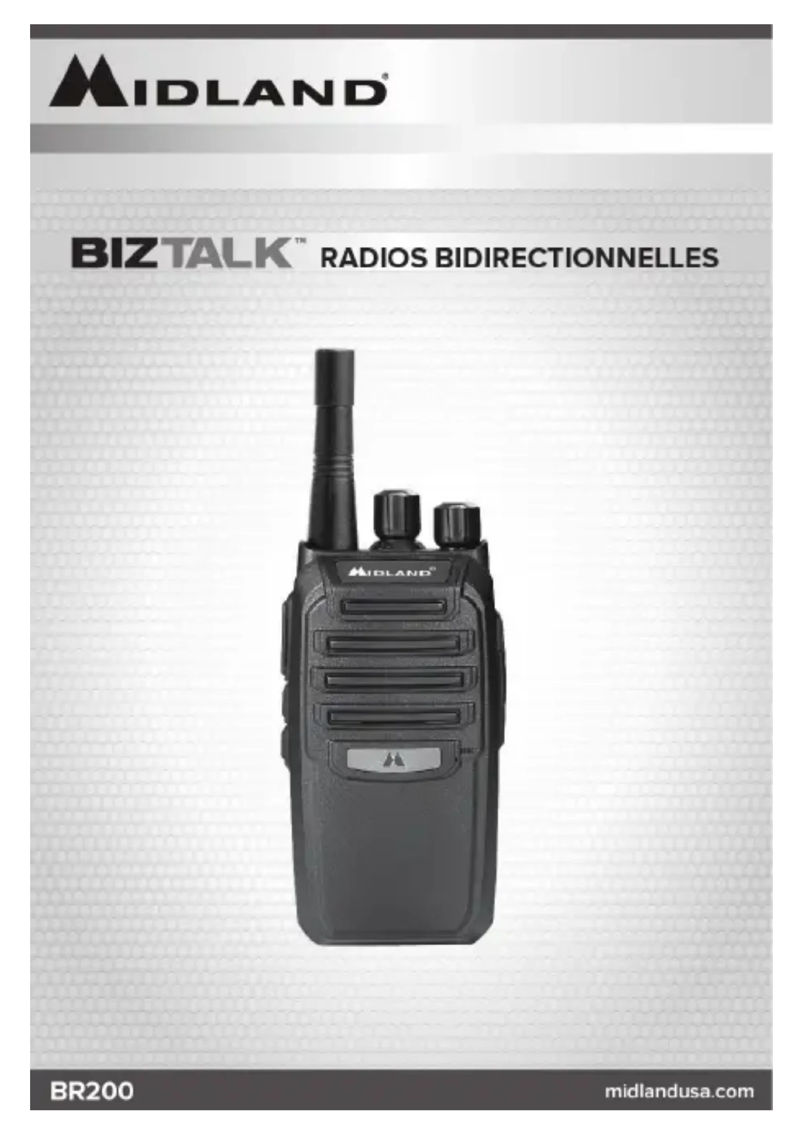 ACCESSOIRES 19 Les accessoires peuvent être achetés sur le site midlandusacom 19Modèle BR200 midlandusa.com Page 3 Depuis plus d'un demi-siècle, Midland Radio offre des produits de communication radio de qualité supérieure, fiables et de valeur sûre En se basant sur ces valeurs fondamentales, Midland BR200 propose aux petites entreprises, aux gens œuvrant dans l'hôtellerie, la construction, l'entreposage, l'entretien et autres domaines, une solution en matière de communication CARACTÉRISTIQUES - 16 canaux - 56 fréquences - 142 codes privés (38 CTCSS / 104 DCS) - Fonction de moniteur - Fonction de balayage - Alerte de batterie par guide vocal et sélection de canal - Haut-parleur externe/prise pour micro - Programmable par PCModèle BR200 midlandusa.comPage 4