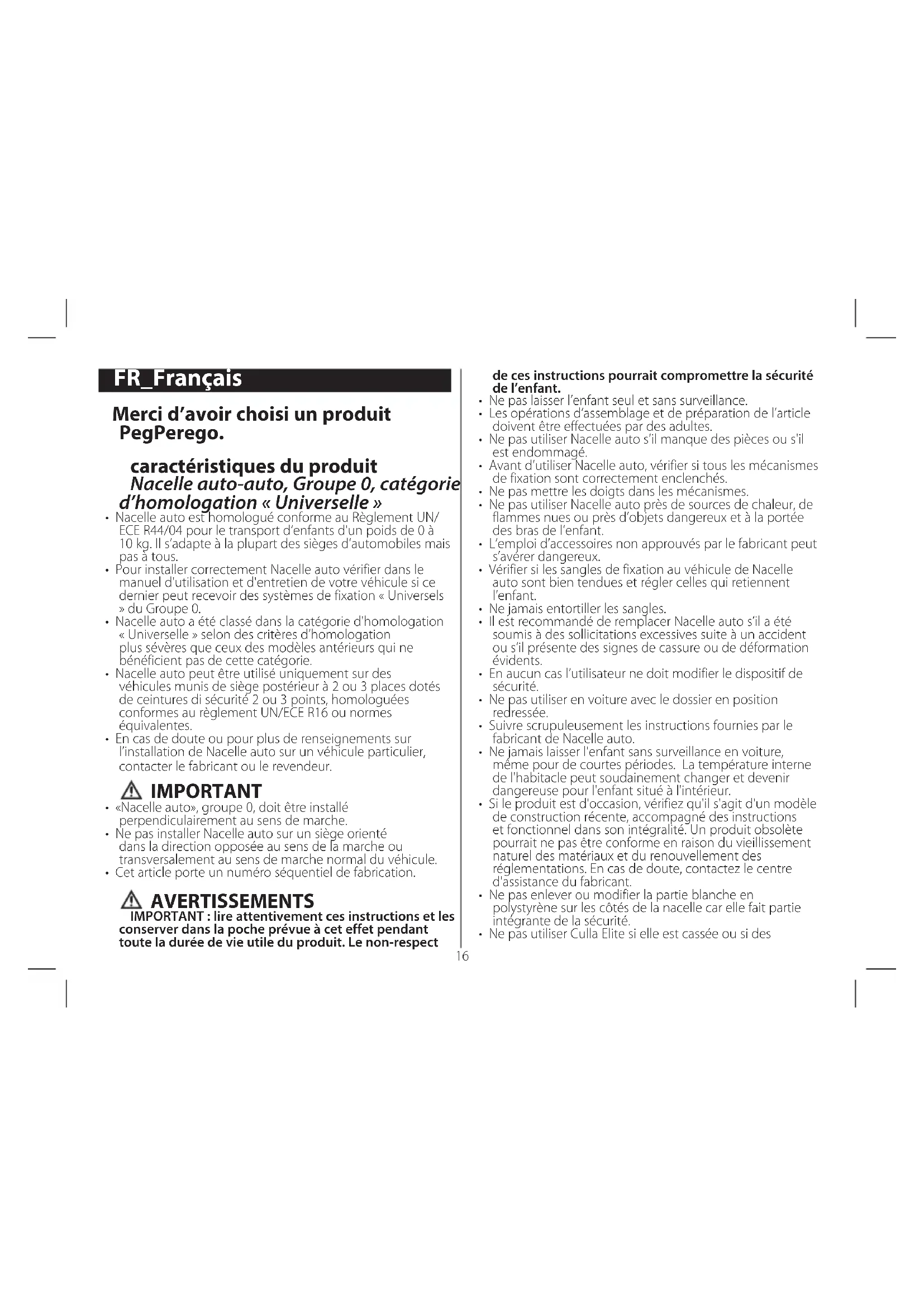 - Cet article porte un numéro séquentiel de fabrication. AVERTISSEMENTS IMPORTANT : lire attentivement ces instructions et les conserver dans la poche prévue à cet effet pendant toute la durée de vie utile du produit. Le non-respect FR_Français de ces instructions pourrait compromettre la sécurité de l’enfant.