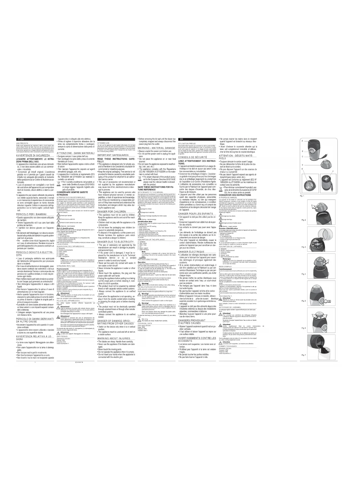 )RQFWLRQQHPHQW Tourner le couvercle dans le sens antihoraire pour ouvrir le récipient (Fig. 2). Insérer le café en grains dans le récipient (Fig. 3). Le récipient a une capa- cité de 35g. Le café en grains ne doit pas surmonter le bord du récipient. Tourner le couvercle dans le sens horaire pour fermer le récipient (Fig. 4). La marque présent sur le récipient doit être alignée avec la marque présent sur le couvercle. Dérouler complètement le cordon d’alimentation depuis la base de l’en- rouleur. ,QWURGXLUHOD¿FKHGDQVODSULVHGHFRXUDQW L’appareil a un fonctionnement à impulsion. Pour pulvériser le café, ap- puyer sur le bouton d’actionnement (Fig. 5). Quand vous avez rejoint la pulvérisation désirée, ouvrir le couvercle et vider le récipient. Tourner le couvercle dans le sens antihoraire pour ouvrir le récipient (Fig. 6). Vider le récipient (Fig. 7). $WWHQWLRQ Attendre au moins un minute avant de procéder avec une ultérieure pulvérisation. Après l’utilisation, enrouler le cordon d’alimentation sur la base d’enrou- lement.