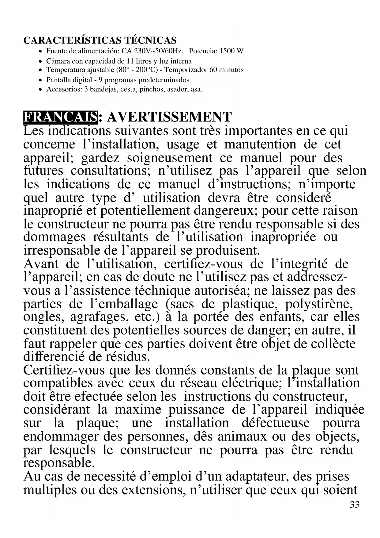 FRANCAIS: AVERTISSEMENT Les indications suivantes sont très importantes en ce qui concerne l’installation, usage et manutention de cet appareil; gardez soigneusement ce manuel pour des futures consultations; n’utilisez pas l’appareil que selon les indications de ce manuel d’instructions; n’importe quel autre type d’ utilisation devra être consideré inaproprié et potentiellement dangereux; pour cette raison le constructeur ne pourra pas être rendu responsable si des dommages résultants de l’utilisation inapropriée ou irresponsable de l’appareil se produisent. Avant de l’utilisation, certifiez-vous de l’integrité de l’appareil; en cas de doute ne l’utilisez pas et addressez- vous a l’assistence téchnique autoriséa; ne laissez pas des parties de l’emballage (sacs de plastique, polystirène, ongles, agrafages, etc.) à la portée des enfants, car elles constituent des potentielles sources de danger; en autre, il faut rappeler que ces parties doivent être objet de collècte differencié de résidus. Certifiez-vous que les donnés constants de la plaque sont compatibles avec ceux du réseau eléctrique; l’installation doit être efectuée selon les instructions du constructeur, considérant la maxime puissance de l’appareil indiquée sur la plaque; une installation défectueuse pourra endommager des personnes, dês animaux ou des objects, par lesquels le constructeur ne pourra pas être rendu responsable. Au cas de necessité d’emploi d’un adaptateur, des prises multiples ou des extensions, n’utiliser que ceux qui soient34 en conformité aux normes de securité en vigueur; entout cas, jamais dépasser les limites d’absortion indiqués sur l’adaptateur simple et/ou sur les extensions, ni ceux de maxime puissance indiqués sur les adaptateurs multiples. Ne pas laisser l’appareil inutilemente connecté a la prise eléctrique; c’est toujours mieux de le déconnecter quand il n’est pas à l’use. Débranchez toujours l'appareil de l'alimentation électrique s'il est laissé sans surveillance et avant de l'assembler et de le désassembler. Pour le nettoyage déconnectez la fiche du secteur électrique. Quand l’appareil soit hors usage et ait été décidé qu’il ne sera pas reparé, on reccomande son inutilisation, en coupant son câble d’alimentation. - Ne pas utiliser l’appareil si le câble d’alimentation ou la fiche de connéction eléctrique sont endommagés, ou encore en cas de court-circuits; dans ce cas là, apporter l’appareil a un centre d’assistence autorisé. - Ne pas approcher le câble d’alimentation d’objects coupants ou de surfaces chaudes, et ne pas tirer sur le cordon d’alimentation pour le débrancher de la prise. Ne le laissez pas pendre du plan de travail où un enfant pourrait le tenir. - L’appareil n’est pas indiqué pour être exposé à des conditions météorologiques défavorables (pluie, vent, humidité, la glace, etc.); Gardez-le dans un endroit sec. Jamais opérer ou même toucher l’appareil avec les mains mouillées ou les pieds nus. - Cet appareil peut être utilisé par des enfants agés de plus de 8 ans et par des personnes avec une réduite capacité phisique, sensorial ou mental, ou encore avec peu d’expérience à son usage, pourvu qu’une supervision adéquate leur en soit assuré, ou s’ils auraient été instruits à l’usage de l’appareil en complete securité. Les opérations de nettoyage e de manutention ne oivent35 pás être efectués par des enfants, sauf pour ceux qui sont agés de plus de 8 ans et sont supervisionés. - Les enfants ne doivent pas jouer avec cet appareil. - Gardez l’appareil et le câble d’alimentation hors la portée des enfants agés de moins de 8 ans. - L’appareil est pour l’usage domestique et intérieur. - Cet appareil peut être utilisé par des personnes ayant des capacités physiques, sensorielles ou mentales réduites, ou qui manquent d'expérience ou de connaissances, si elles ont été correctement supervisées ou ont reçu des instructions pour utiliser cet appareil en toute sécurité. Au cas de panne et/ou de mauvais fonctionnement, ne pas intervenir sur l’ appareil. Pour une éventuel réparation s’addresser uniquement a un centre autorisé par le constructeur, en demandant dês pièces de remplacement originaux. Le non respect de ces indications peut compromettre la securité de l’appareil e rendre invalides les termes de la garantie. - Cet appareil est destiné à être utilisé dans les ménages et des applications similaires: les cuisines du personnel dans les magasins, bureaux et autres environnements de travail, pour les clients dans les hôtels, motels et autres environnements de type résidentiel, de type lit et petit- déjeuner, hébergement. - L’appareil n’est pas conçu pour être utilisé avec une minuterie extérieure ou une commande à distance. - N’utiliser que des accéssoires e pièces d’origine. - Avant chaque utilisation, effectuez le cordon d'alimentation. Ne soumettez pas le produit à des chocs susceptibles de l'endommager. - Ne pas utiliser sous ou près des matériaux inflammables comme des rideaux, sources de chaleur, endroits froids et vapeur. -Placer toujours les aliments à cuir dans le récipient afin d’éviter qu’ils touchent la partie chauffante.36 Ne pas couvrir les ouvertures de ventilation quand l’appareil est en fonction. Ne pas remplir le récipient avec de l’huile : risque d’incendie. Ne pas toucher la partie intérieure de l’appareil quand il est en fonction.