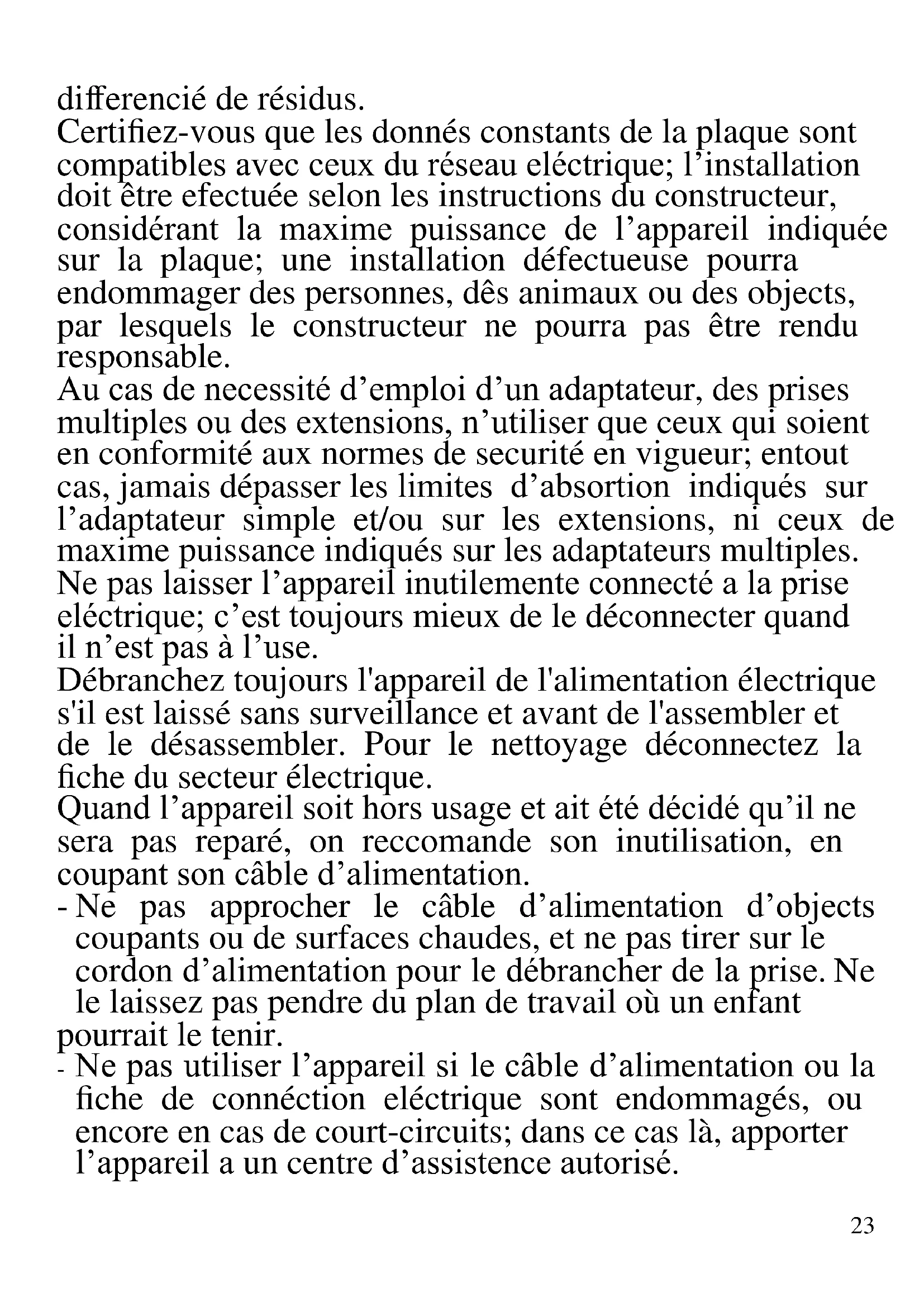 FRANCAIS: ADVERTISSEMENT Les indications suivantes sont très importantes en ce qui concerne l’installation, usage et manutention de cet appareil; gardez soigneusement ce manuel pour des futures consultations; n’utilisez pas l’appareil que selon les indications de ce manuel d’instructions; n’importe quel autre type d’ utilisation devra être consideré inaproprié et potentiellement dangereux; pour cette raison le constructeur ne pourra pas être rendu responsable si des dommages résultants de l’utilisation inapropriée ou irresponsable de l’appareil se produisent. Avant de l’utilisation, certifiez-vous de l’integrité de l’appareil; en cas de doute ne l’utilisez pas et addressez- vous a l’assistence téchnique autoriséa; ne laissez pas des parties de l’emballage (sacs de plastique, polystirène, ongles, agrafages, etc.) à la portée des enfants, car elles constituent des potentielles sources de danger; en autre, il faut rappeler que ces parties doivent être objet de collècte23 differencié de résidus. Certifiez-vous que les donnés constants de la plaque sont compatibles avec ceux du réseau eléctrique; l’installation doit être efectuée selon les instructions du constructeur, considérant la maxime puissance de l’appareil indiquée sur la plaque; une installation défectueuse pourra endommager des personnes, dês animaux ou des objects, par lesquels le constructeur ne pourra pas être rendu responsable. Au cas de necessité d’emploi d’un adaptateur, des prises multiples ou des extensions, n’utiliser que ceux qui soient en conformité aux normes de securité en vigueur; entout cas, jamais dépasser les limites d’absortion indiqués sur l’adaptateur simple et/ou sur les extensions, ni ceux de maxime puissance indiqués sur les adaptateurs multiples. Ne pas laisser l’appareil inutilemente connecté a la prise eléctrique; c’est toujours mieux de le déconnecter quand il n’est pas à l’use. Débranchez toujours l'appareil de l'alimentation électrique s'il est laissé sans surveillance et avant de l'assembler et de le désassembler. Pour le nettoyage déconnectez la fiche du secteur électrique. Quand l’appareil soit hors usage et ait été décidé qu’il ne sera pas reparé, on reccomande son inutilisation, en coupant son câble d’alimentation. - Ne pas approcher le câble d’alimentation d’objects coupants ou de surfaces chaudes, et ne pas tirer sur le cordon d’alimentation pour le débrancher de la prise. Ne le laissez pas pendre du plan de travail où un enfant pourrait le tenir. - Ne pas utiliser l’appareil si le câble d’alimentation ou la fiche de connéction eléctrique sont endommagés, ou encore en cas de court-circuits; dans ce cas là, apporter l’appareil a un centre d’assistence autorisé.24 - L’appareil n’est pas indiqué pour être exposé à des conditions météorologiques défavorables (pluie, vent, humidité, la glace, etc.); Gardez-le dans un endroit sec. Jamais opérer ou même toucher l’appareil avec les mains mouillées ou les pieds nus. - Cet appareil peut être utilisé par des enfants agés de plus de 8 ans et par des personnes avec une réduite capacité phisique, sensorial ou mental, ou encore avec peu d’expérience à son usage, pourvu qu’une supervision adéquate leur en soit assuré, ou s’ils auraient été instruits à l’usage de l’appareil en complete securité. Les opérations de nettoyage e de manutention ne oivent pás être efectués par des enfants, sauf pour ceux qui sont agés de plus de 8 ans et sont supervisionés. - Les enfants ne doivent pas jouer avec cet appareil. - Gardez l’appareil et le câble d’alimentation hors la portée des enfants agés de moins de 8 ans. Le derrière de l’appareil doit être tourné contre un mur. - L’appareil est pour l’usage domestique et intérieur. Au cas de panne et/ou de mauvais fonctionnement, ne pas intervenir sur l’ appareil. Pour une éventuel réparation s’addresser uniquement a un centre autorisé par le constructeur, en demandant dês pièces de remplacement originaux. Le non respect de ces indications peut compromettre la securité de l’appareil e rendre invalides les termes de la garantie. ATENTTION: Cet appareil comporte une fonction de chauffage. Quelques surfaces, même si non la plaque elle même, pourront atteindre des températures élevées. Étant donné que la sensibilité à la température diffère de personne à personne, cet appareil devrà être usé avec PRUDENCE. Placez l’appareil sur des surfaces adéhrentes et préparées pour cet effet, et utilisez les mésures de protection contre la chaleur conseillées, comme dês poignées ou des gants de cuisine.25 - Cet appareil est destiné à être utilisé dans les ménages et des applications similaires: les cuisines du personnel dans les magasins, bureaux et autres environnements de travail, pour les clients dans les hôtels, motels et autres environnements de type résidentiel, de type lit et petit- déjeuner, hébergement. - L’appareil n’est pas conçu pour être utilisé avec une minuterie extérieure ou un commande à distance. - N’utiliser que des accéssoires e pièces d’origine. Avant chaque utilisation, effectuez le cordon d'alimentation. Ne soumettez pas le produit à des chocs susceptibles de l'endommager.